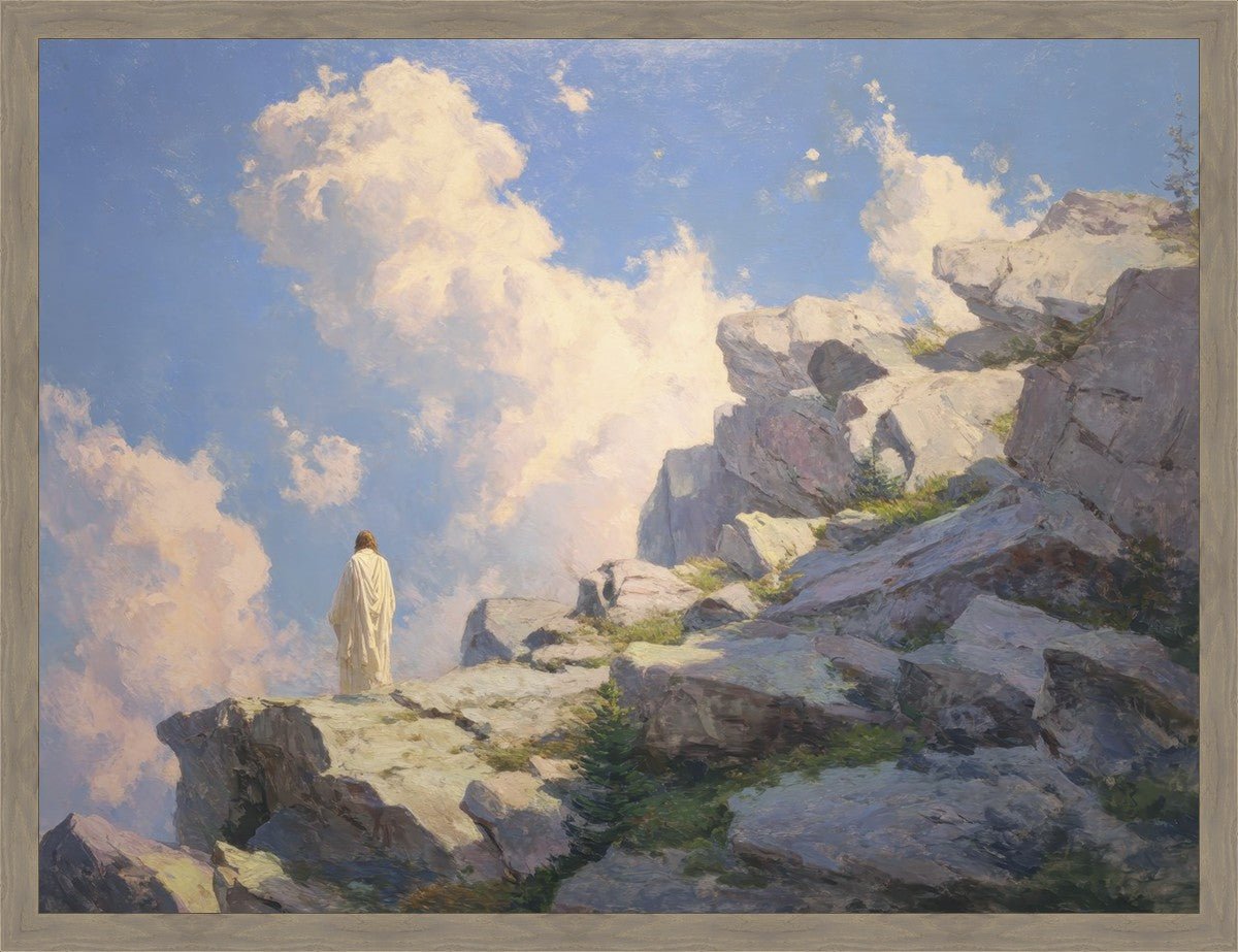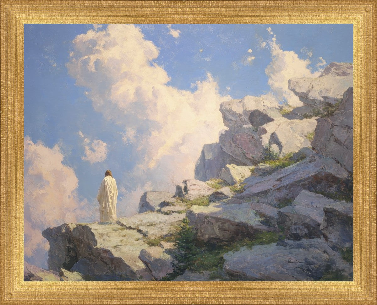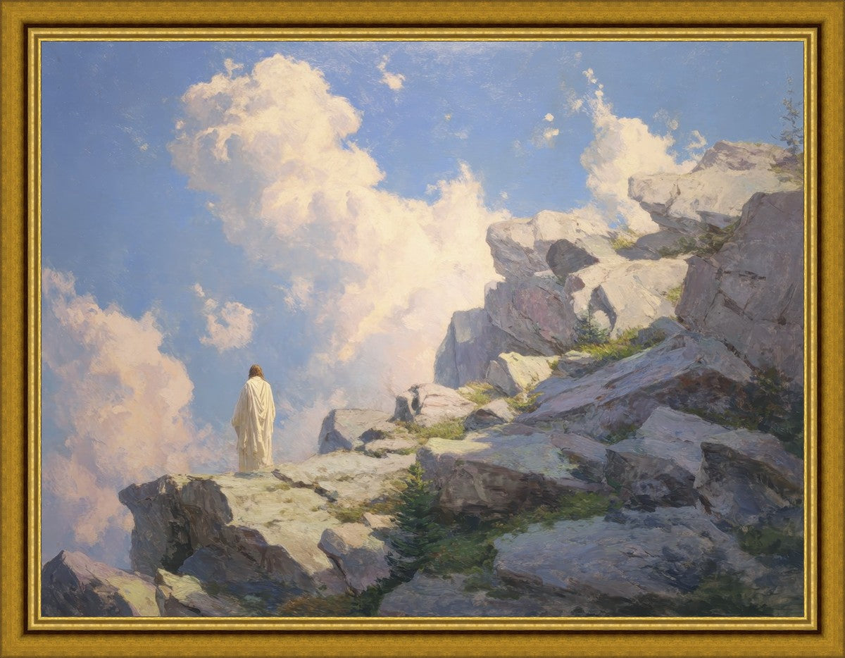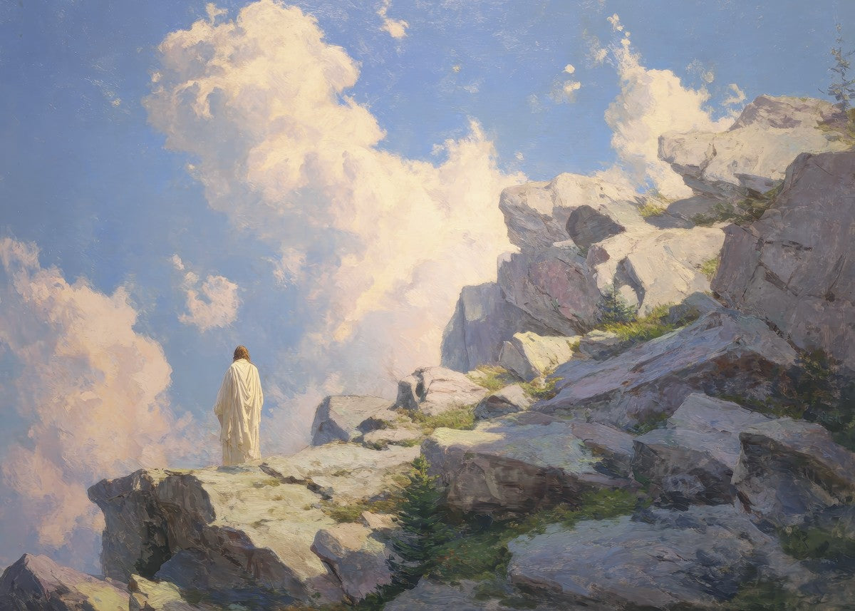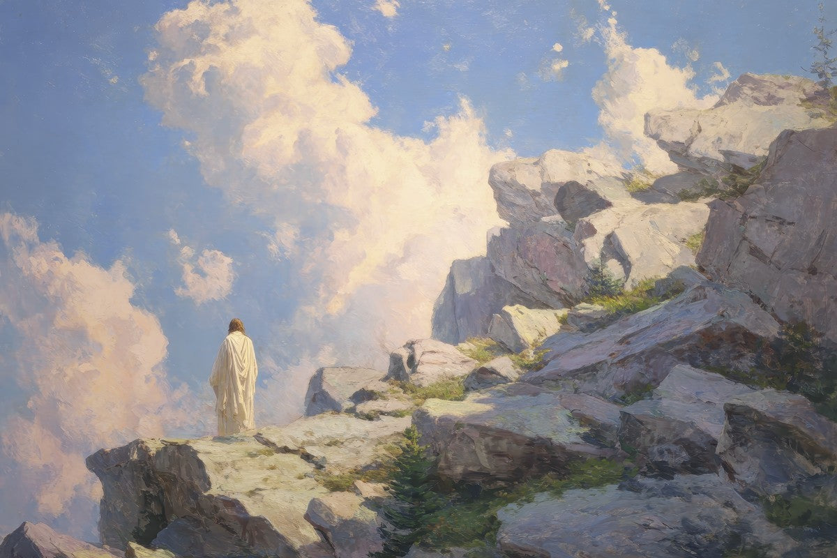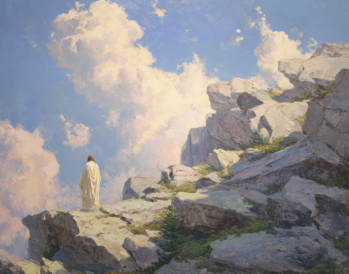 Throughout His mortal ministry, the Savior often withdrew to quiet places to pray, reflect, and commune with His Father. On Holy Ground captures that stillness. Christ stands alone in the mountains, surrounded by simultaneous majesty and peace. The scene reflects the beauty of solitude when it is filled with divine connection. In a world that is often loud and hurried, this image is a reminder of the holiness that can be found in solitude. We wanted this piece to evoke the idea that even the Savior took time to step away from everything and simply seek connection with heaven. As we make space to be alone with God, we too can find clarity, strength, and peace in His presence. Digital artwork created with Midjourney and Photoshop. Created 2026.