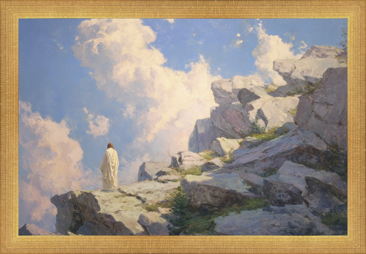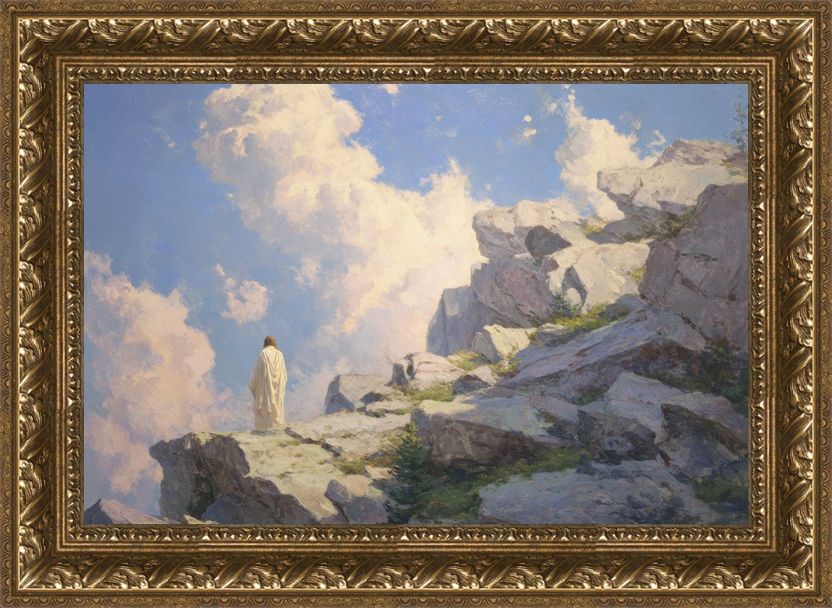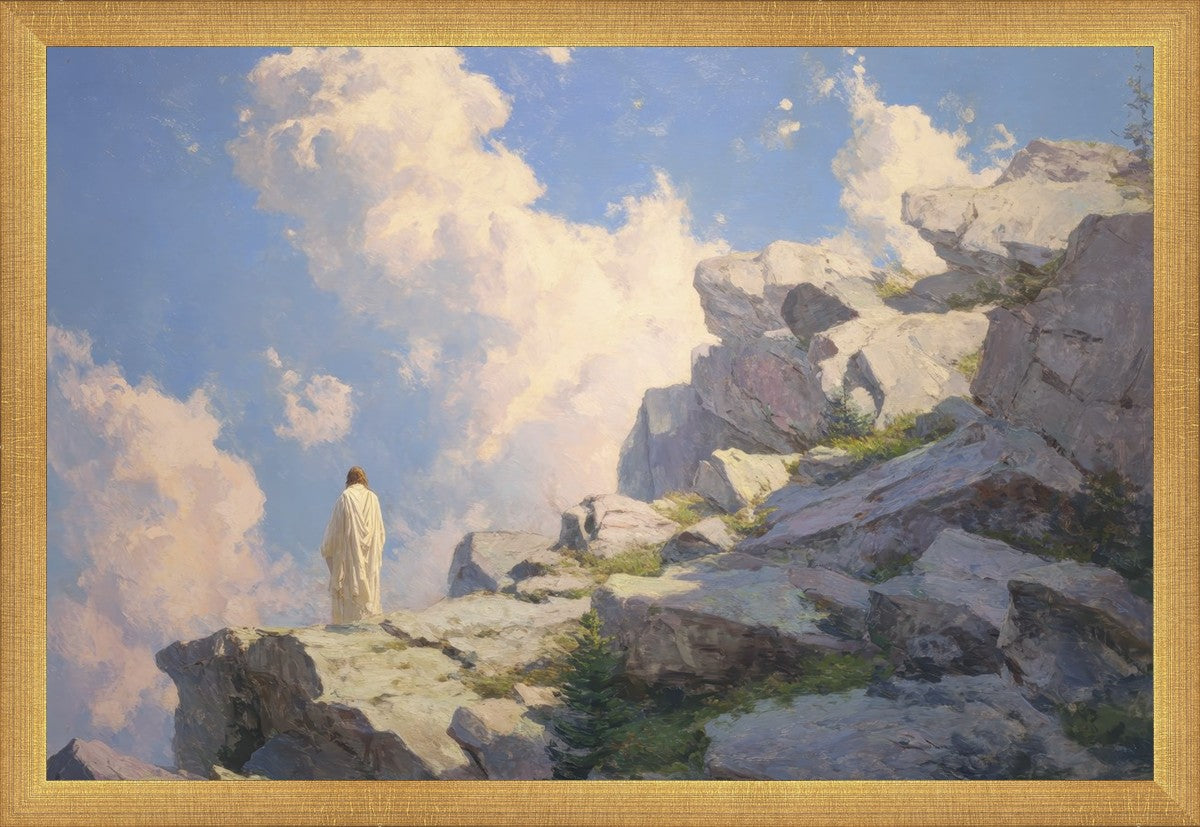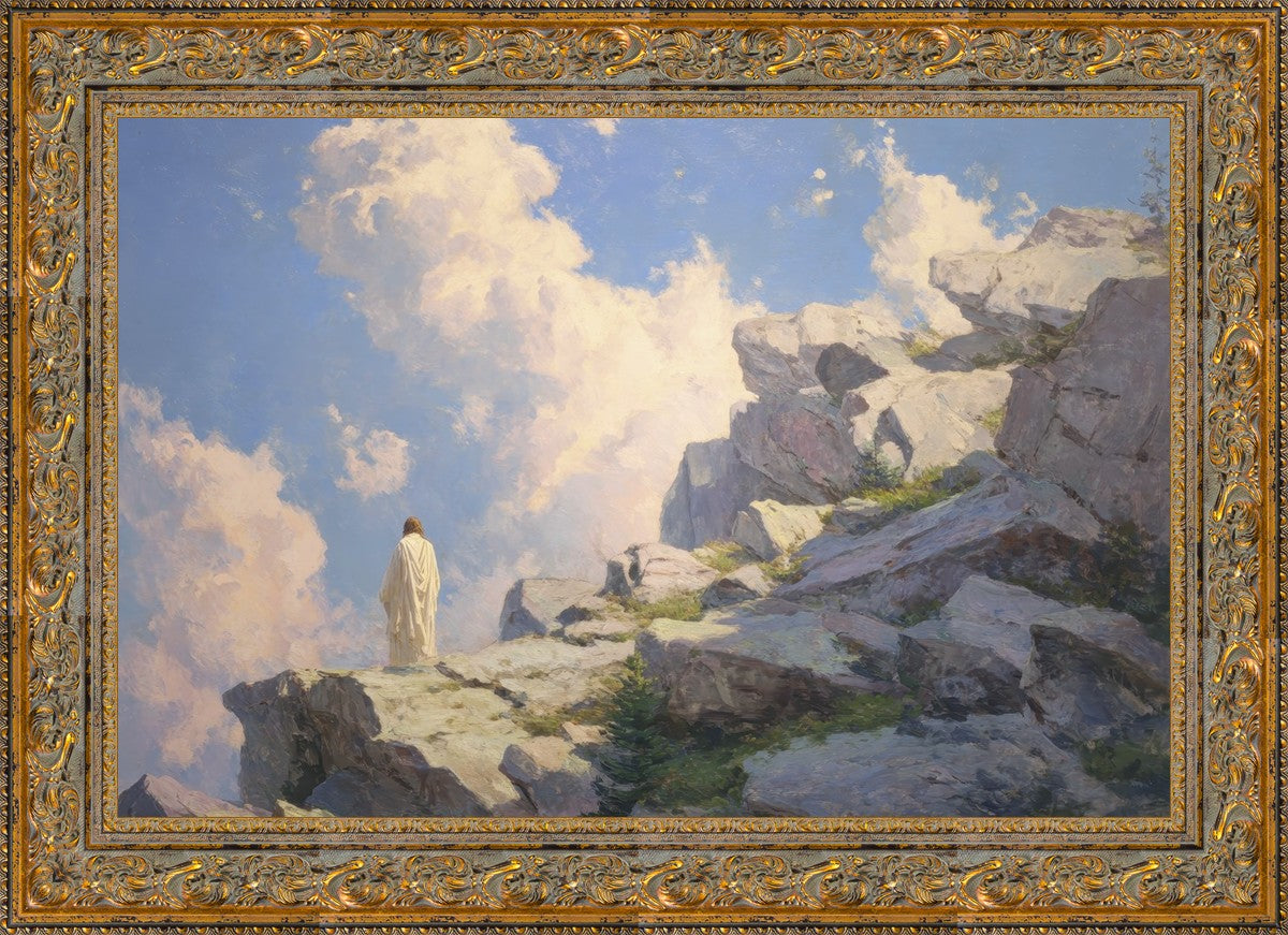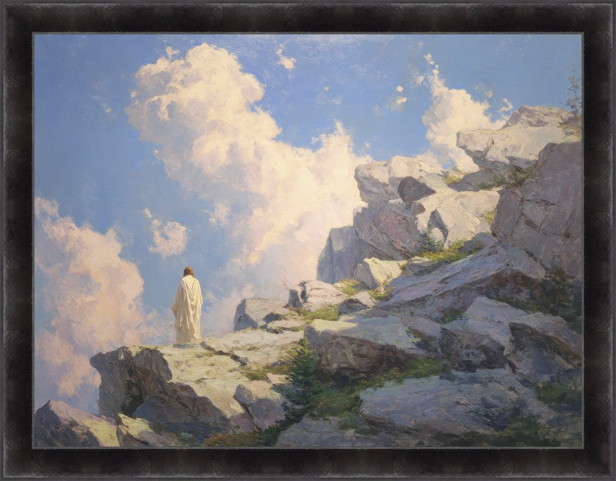 Throughout His mortal ministry, the Savior often withdrew to quiet places to pray, reflect, and commune with His Father. On Holy Ground captures that stillness. Christ stands alone in the mountains, surrounded by simultaneous majesty and peace. The scene reflects the beauty of solitude when it is filled with divine connection. In a world that is often loud and hurried, this image is a reminder of the holiness that can be found in solitude. We wanted this piece to evoke the idea that even the Savior took time to step away from everything and simply seek connection with heaven. As we make space to be alone with God, we too can find clarity, strength, and peace in His presence. Digital artwork created with Midjourney and Photoshop. Created 2026.
