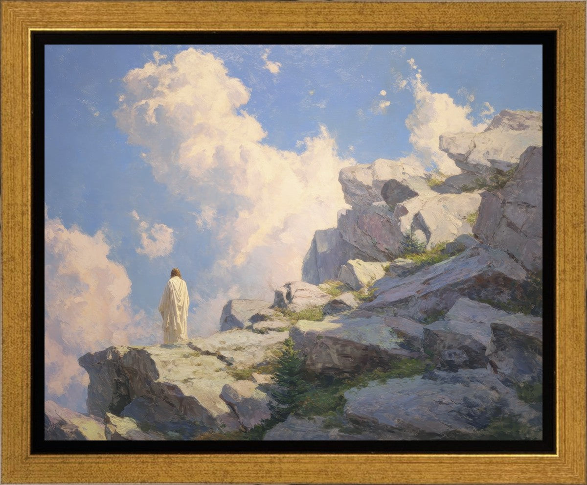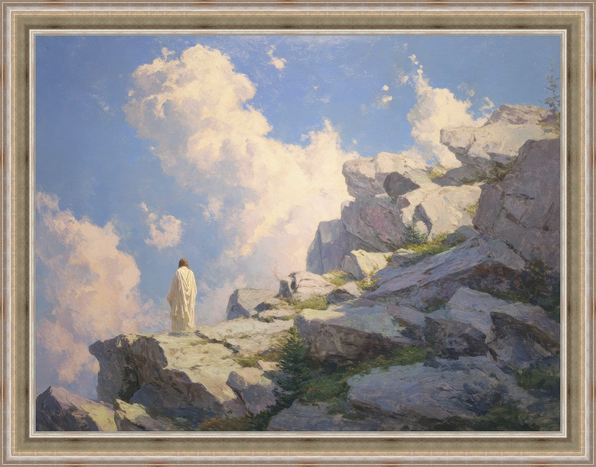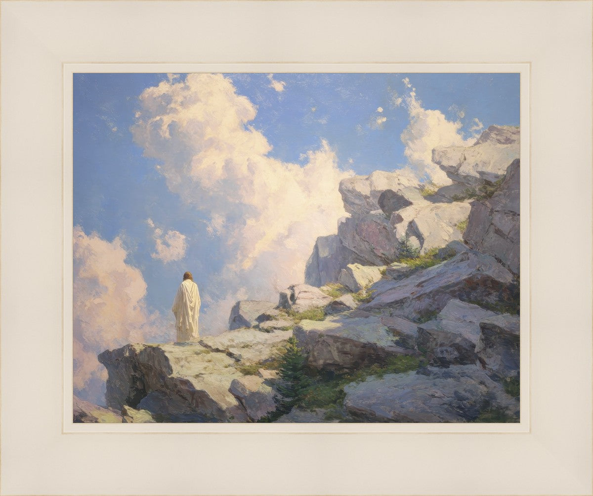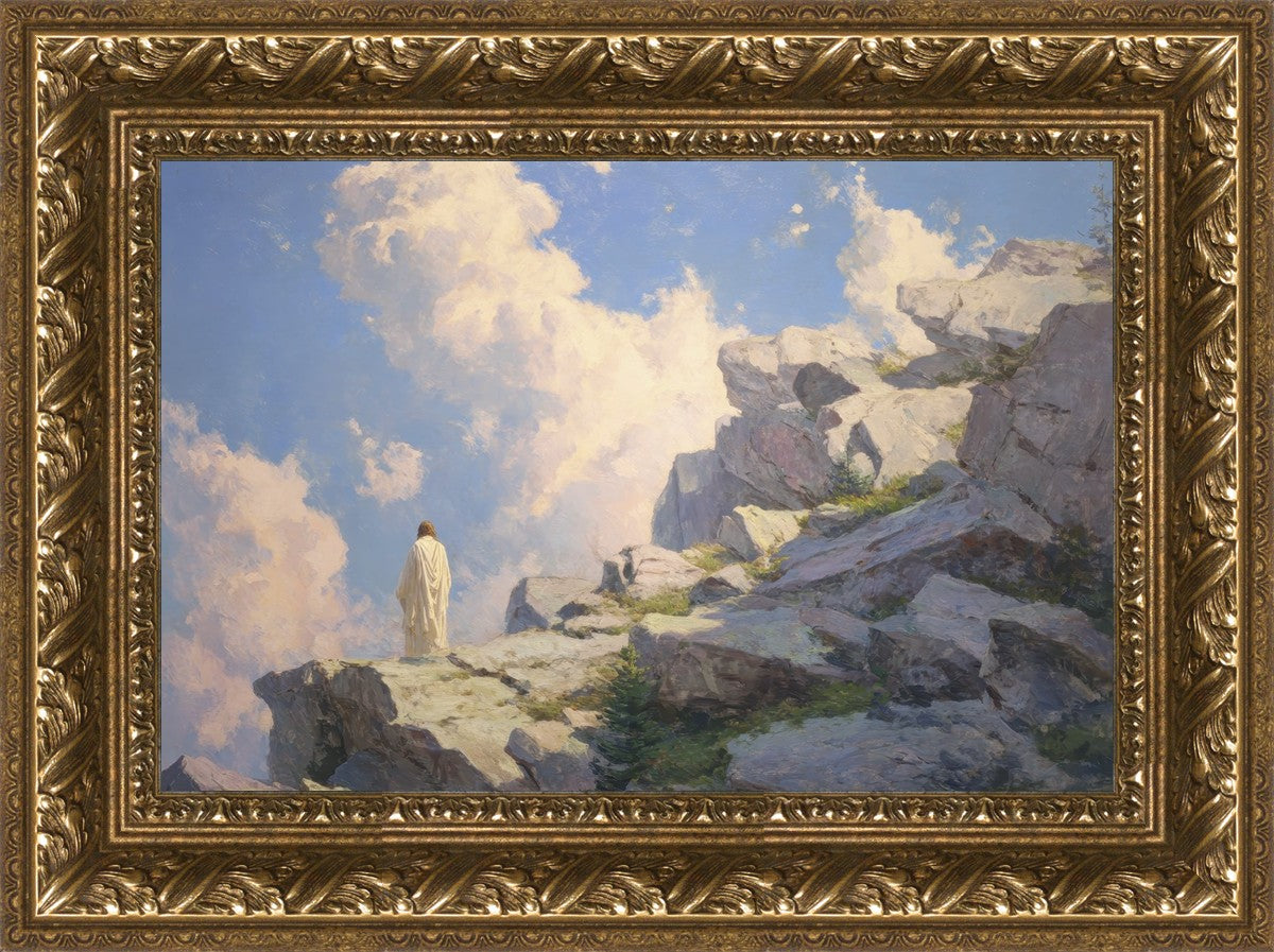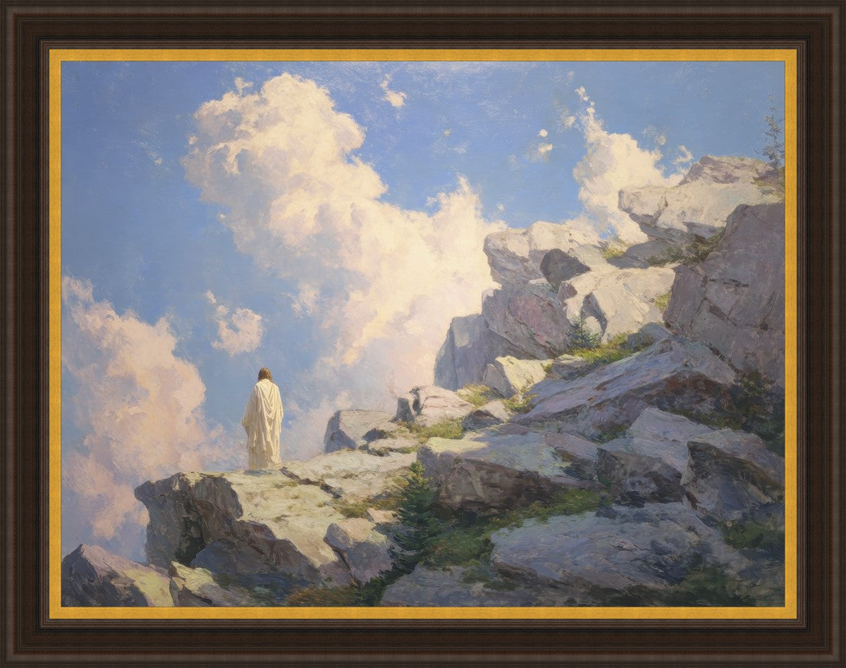 Throughout His mortal ministry, the Savior often withdrew to quiet places to pray, reflect, and commune with His Father. On Holy Ground captures that stillness. Christ stands alone in the mountains, surrounded by simultaneous majesty and peace. The scene reflects the beauty of solitude when it is filled with divine connection. In a world that is often loud and hurried, this image is a reminder of the holiness that can be found in solitude. We wanted this piece to evoke the idea that even the Savior took time to step away from everything and simply seek connection with heaven. As we make space to be alone with God, we too can find clarity, strength, and peace in His presence. Digital artwork created with Midjourney and Photoshop. Created 2026.
