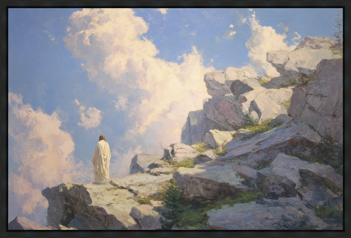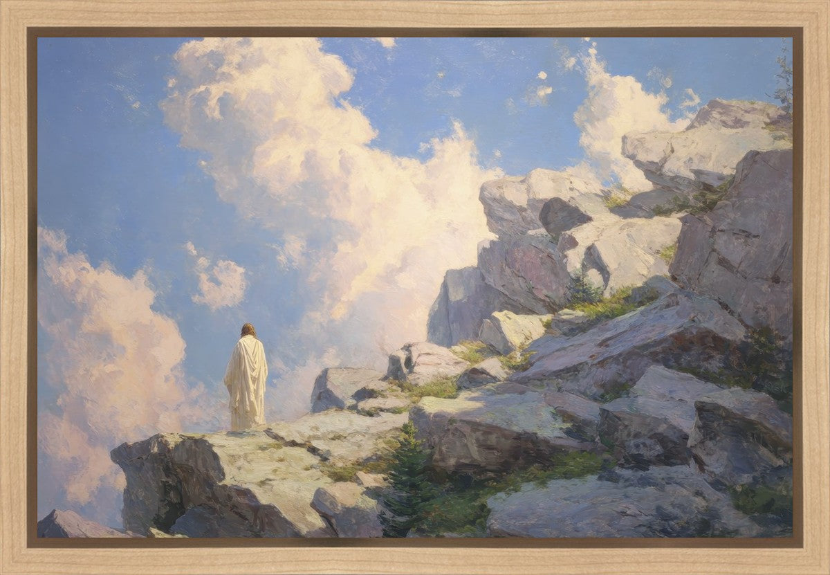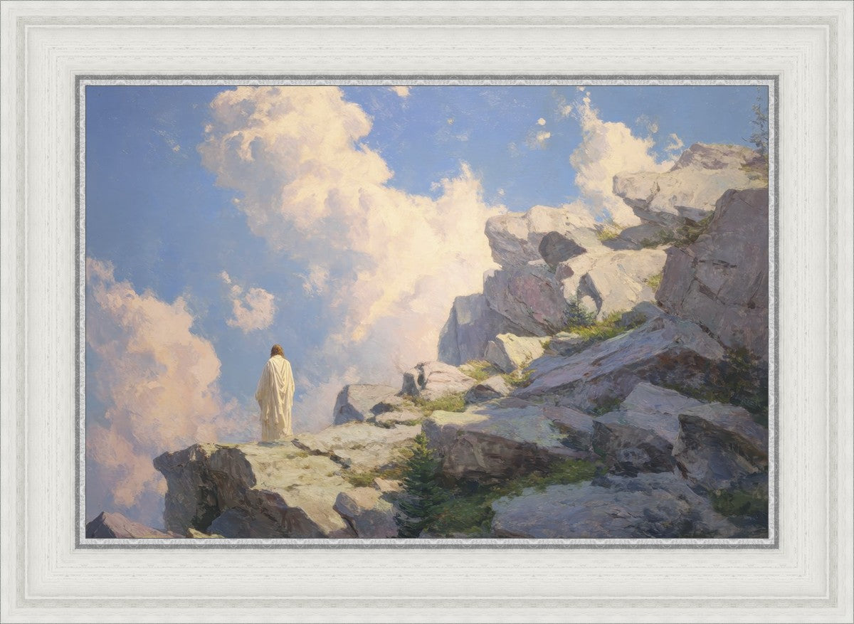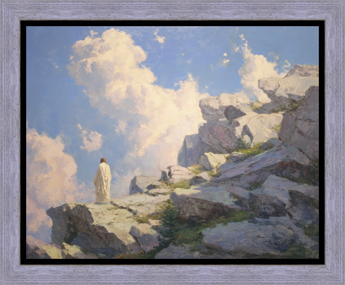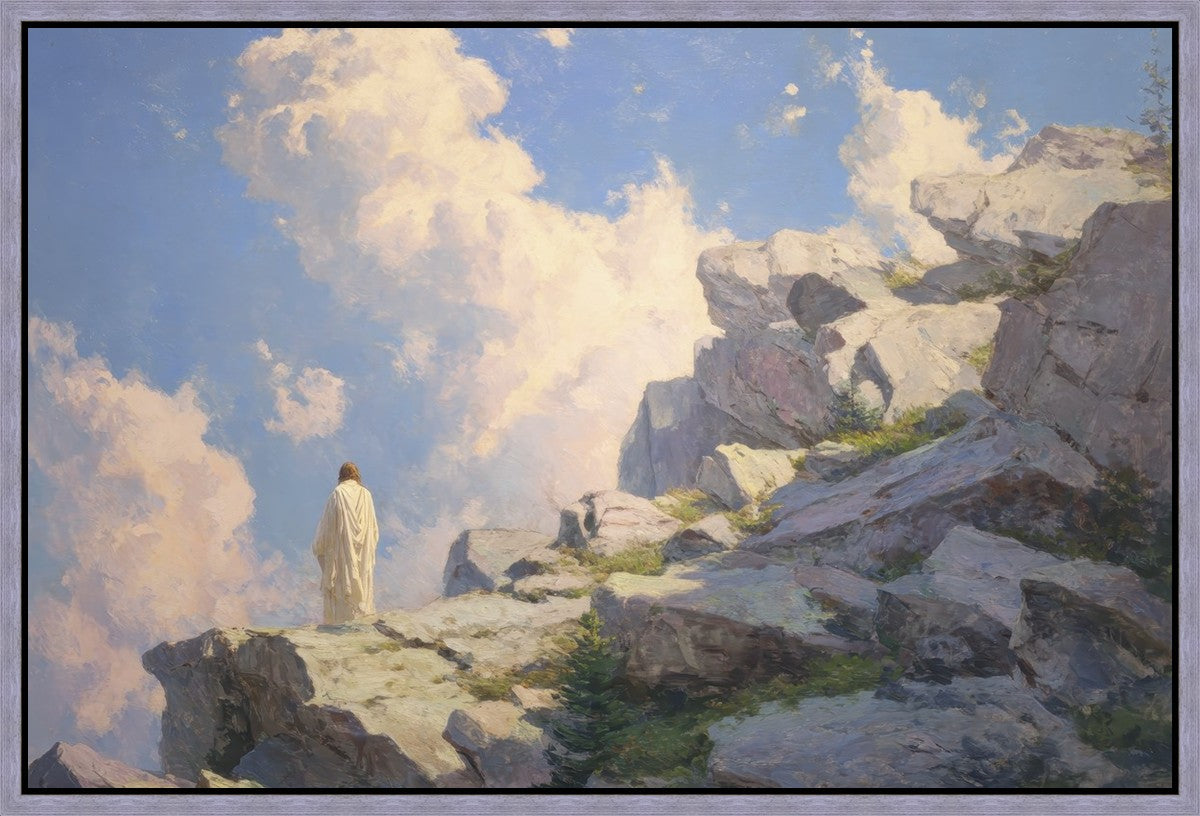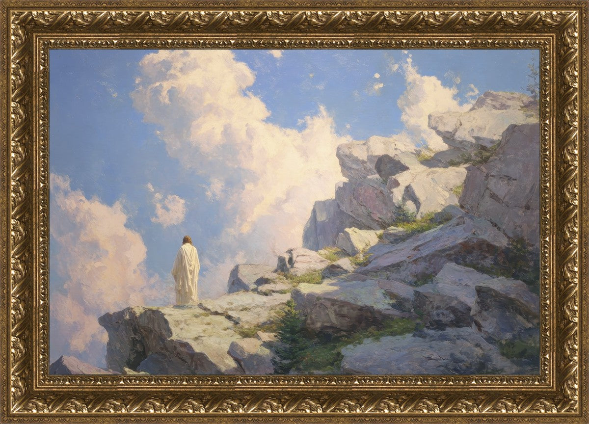 Throughout His mortal ministry, the Savior often withdrew to quiet places to pray, reflect, and commune with His Father. On Holy Ground captures that stillness. Christ stands alone in the mountains, surrounded by simultaneous majesty and peace. The scene reflects the beauty of solitude when it is filled with divine connection. In a world that is often loud and hurried, this image is a reminder of the holiness that can be found in solitude. We wanted this piece to evoke the idea that even the Savior took time to step away from everything and simply seek connection with heaven. As we make space to be alone with God, we too can find clarity, strength, and peace in His presence. Digital artwork created with Midjourney and Photoshop. Created 2026.