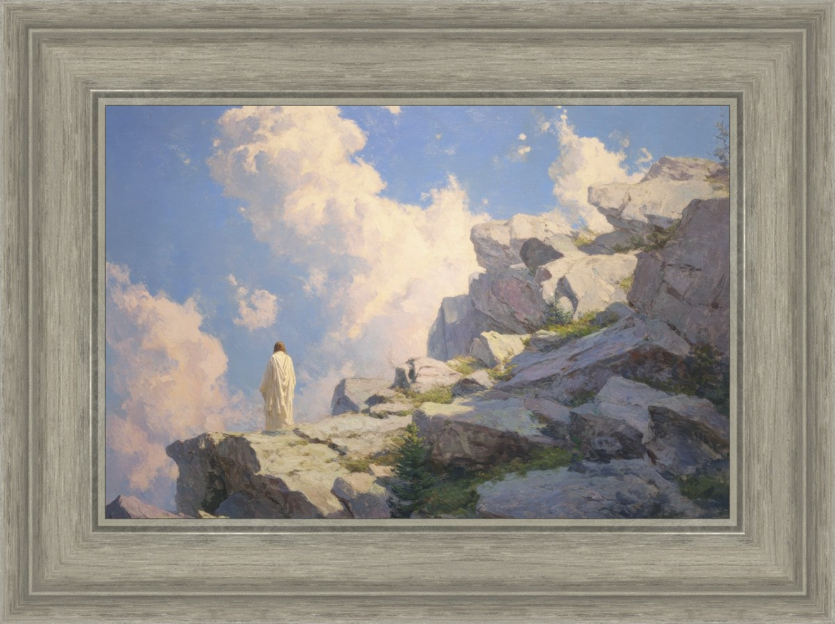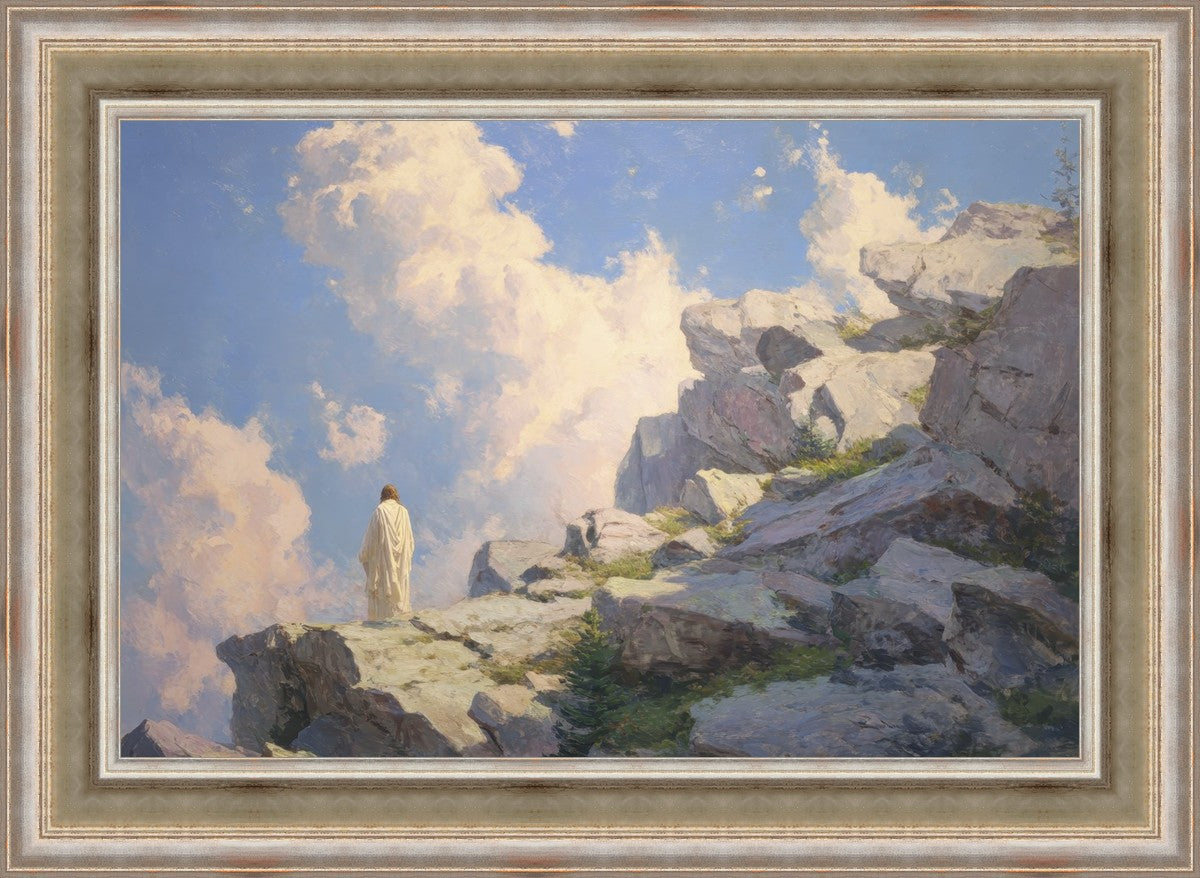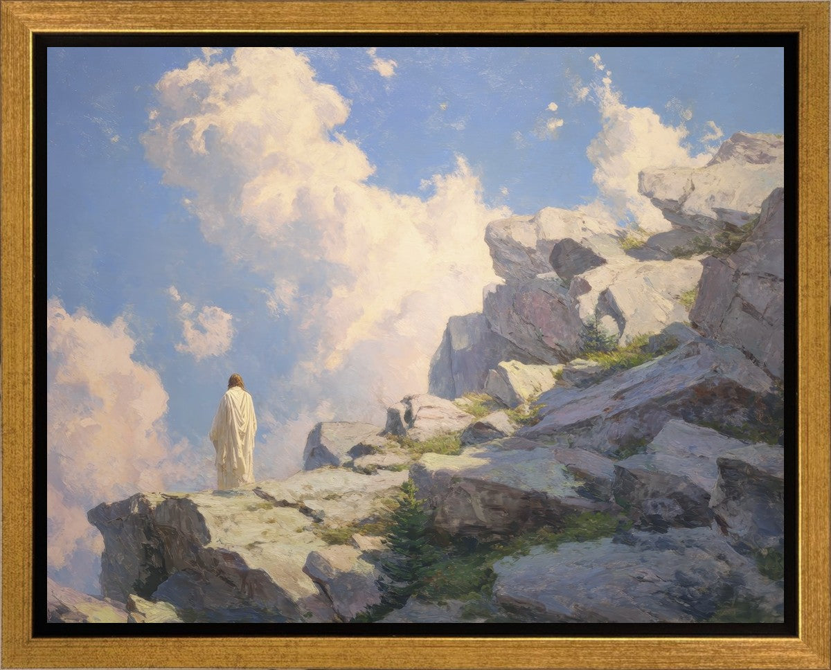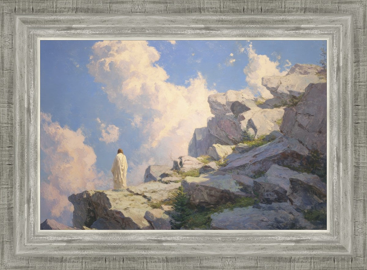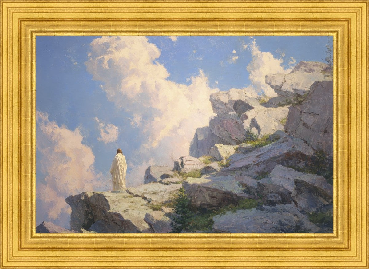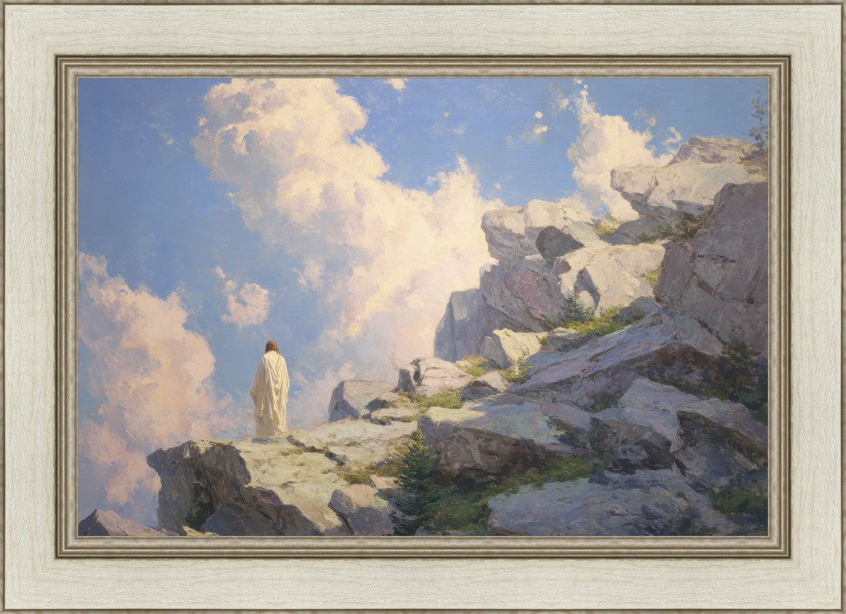 Throughout His mortal ministry, the Savior often withdrew to quiet places to pray, reflect, and commune with His Father. On Holy Ground captures that stillness. Christ stands alone in the mountains, surrounded by simultaneous majesty and peace. The scene reflects the beauty of solitude when it is filled with divine connection. In a world that is often loud and hurried, this image is a reminder of the holiness that can be found in solitude. We wanted this piece to evoke the idea that even the Savior took time to step away from everything and simply seek connection with heaven. As we make space to be alone with God, we too can find clarity, strength, and peace in His presence. Digital artwork created with Midjourney and Photoshop. Created 2026.
