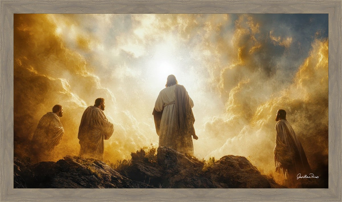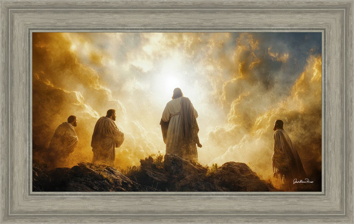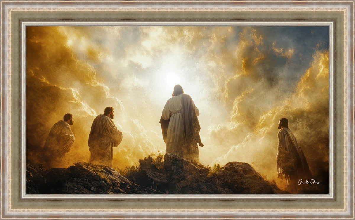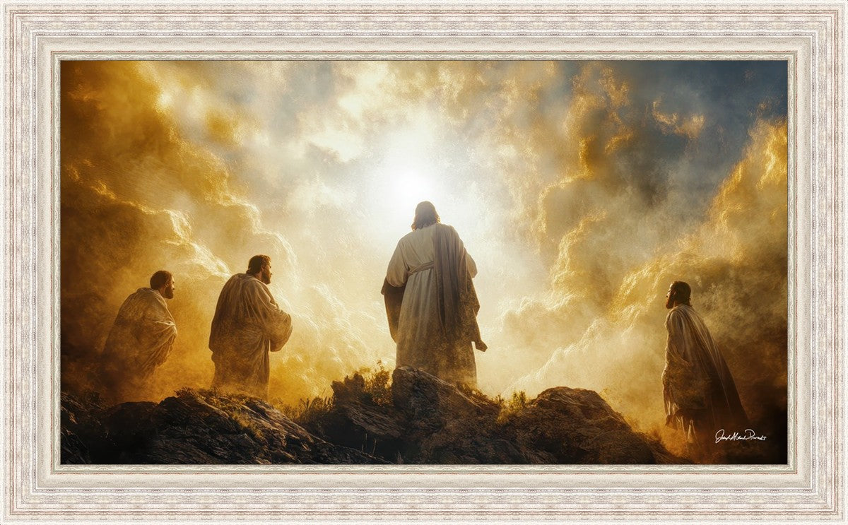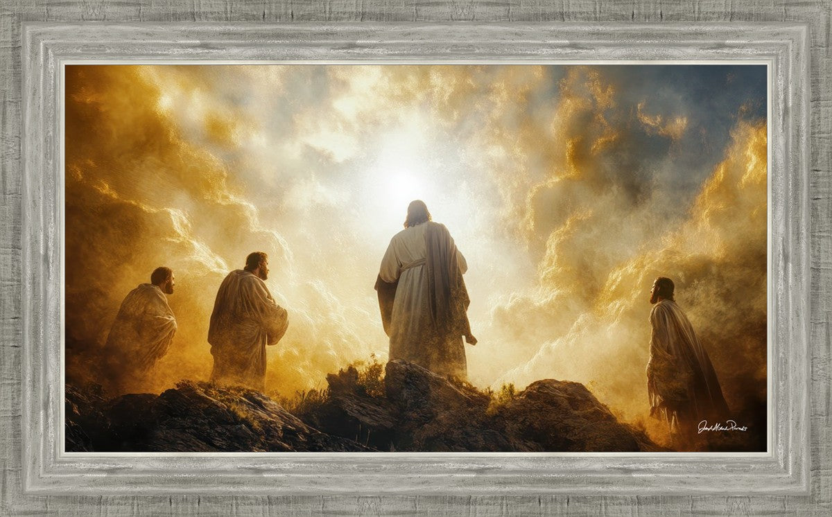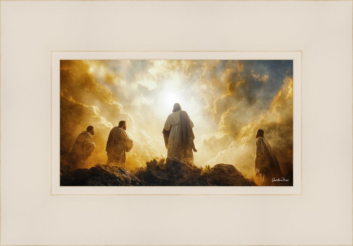 Imagine being witness to the Mount of Transfiguration, and the wonders that you might have beheld. It is said in the scriptures that Peter, James and John were so amazed by what they saw and heard, that they fell on their face. This artwork presents an upward looking perspective of reverence for the Lord and His power.