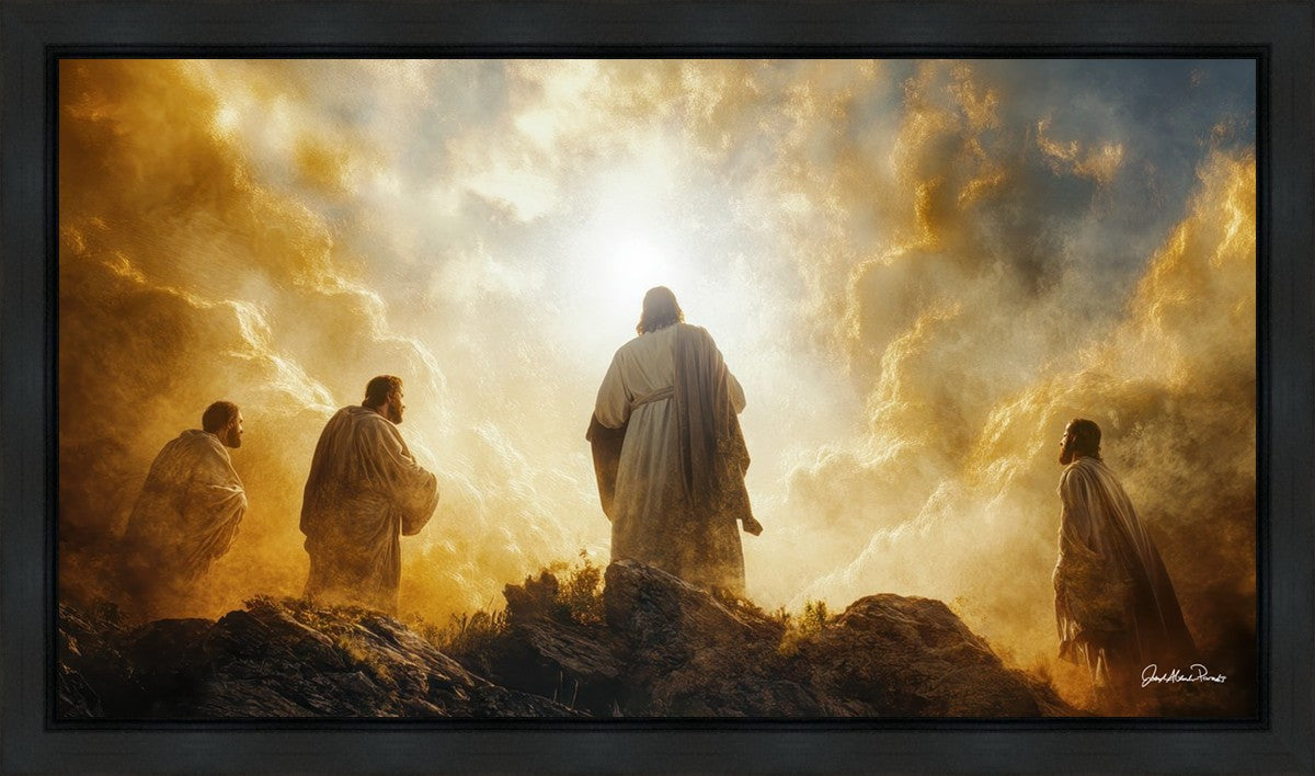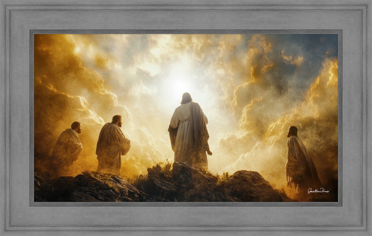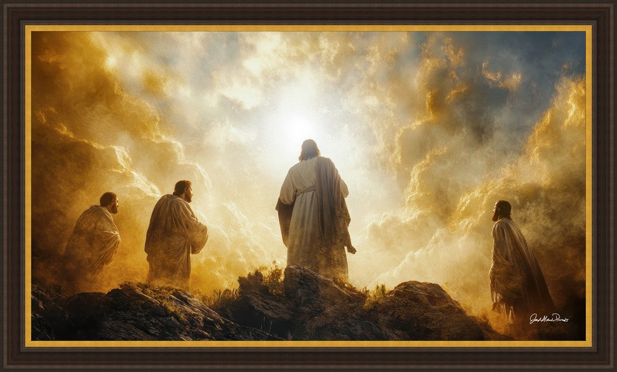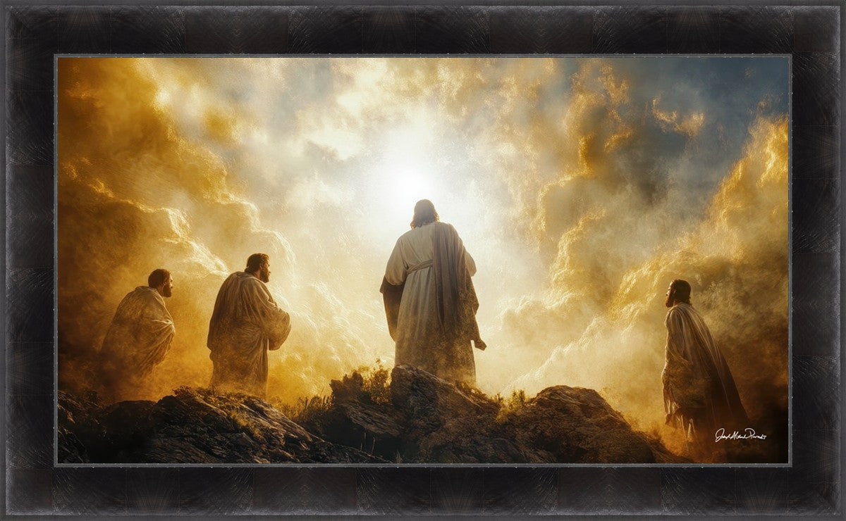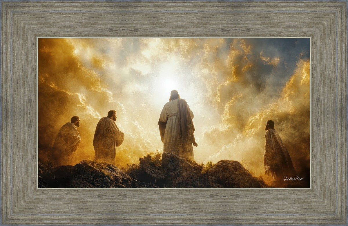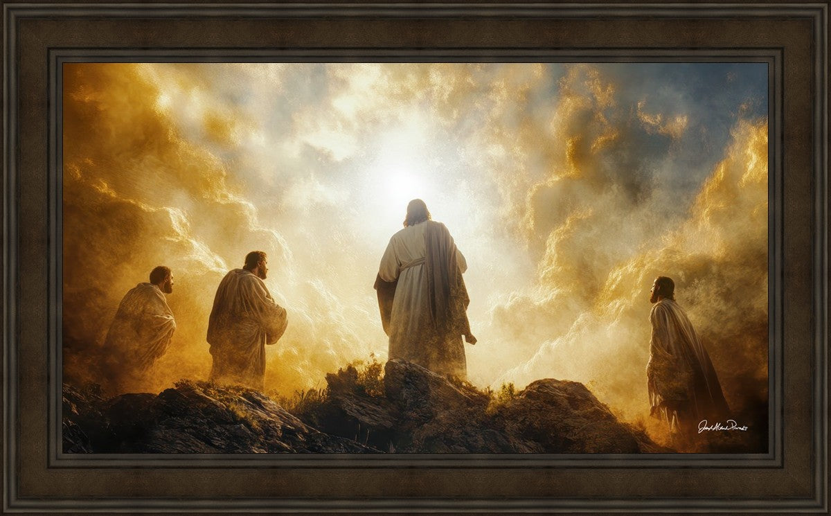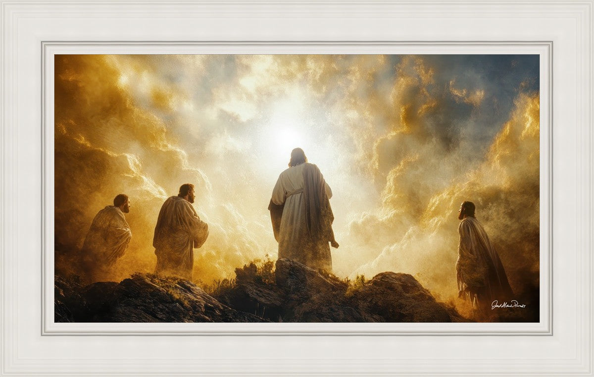 Imagine being witness to the Mount of Transfiguration, and the wonders that you might have beheld. It is said in the scriptures that Peter, James and John were so amazed by what they saw and heard, that they fell on their face. This artwork presents an upward looking perspective of reverence for the Lord and His power.