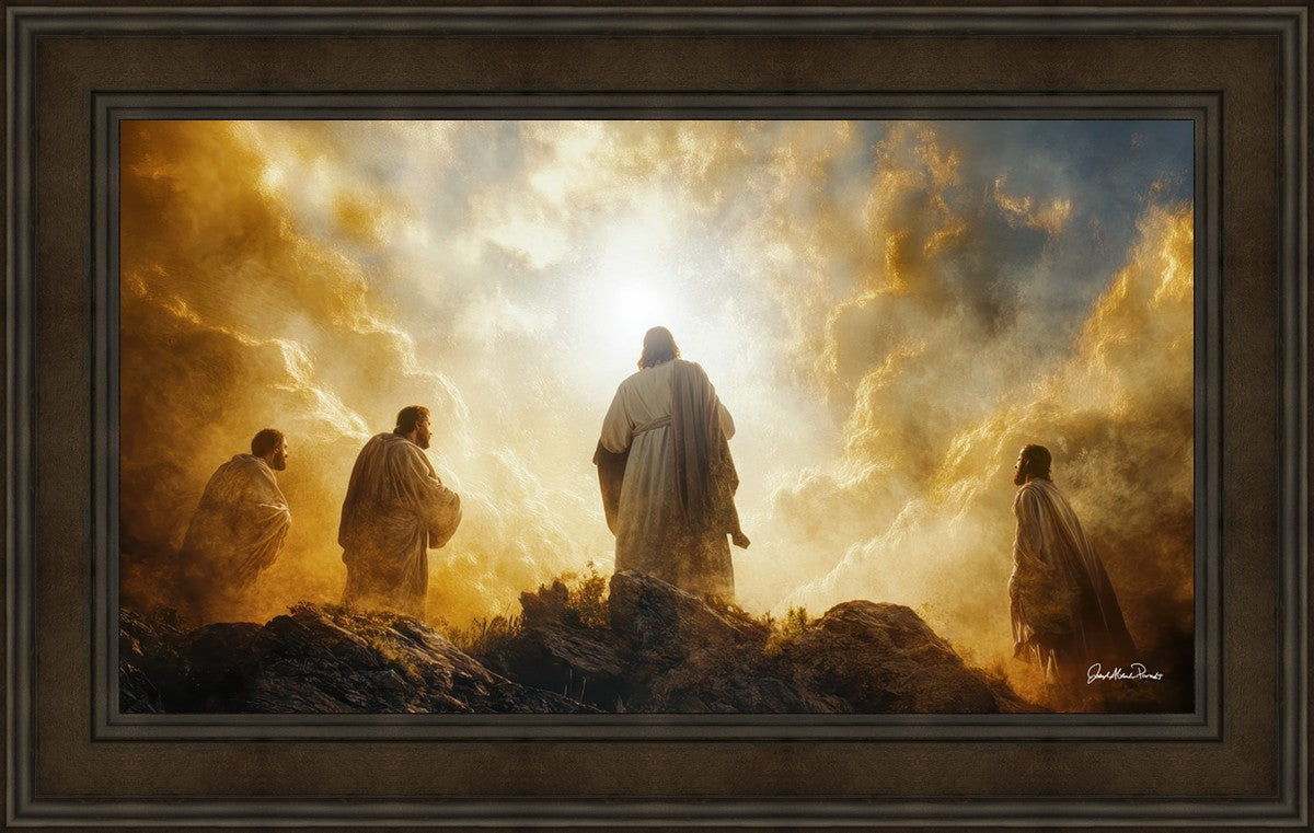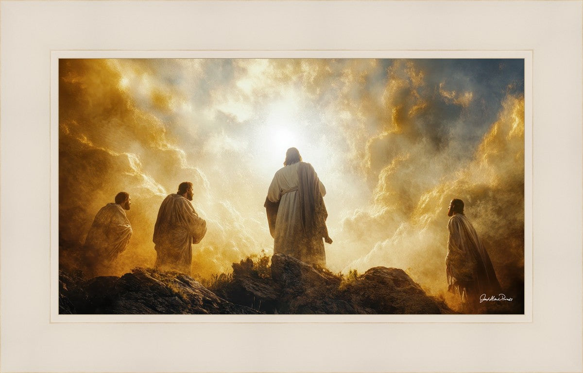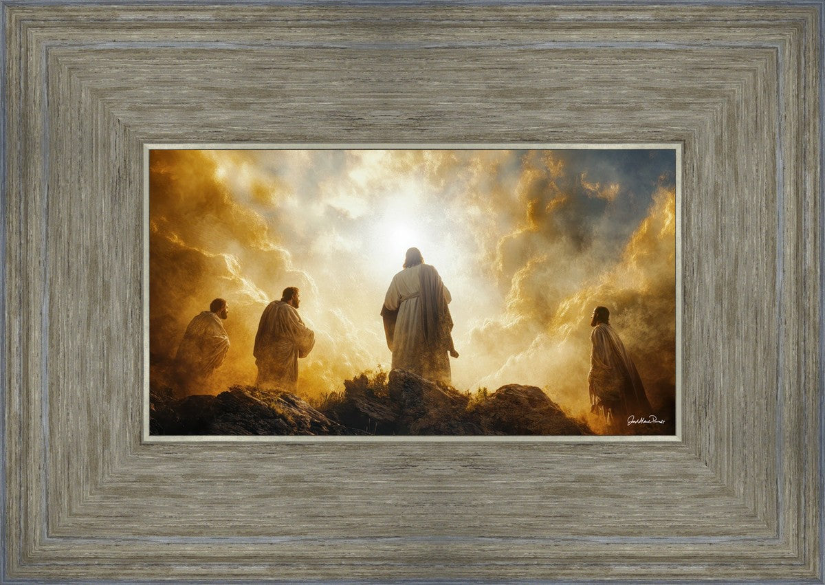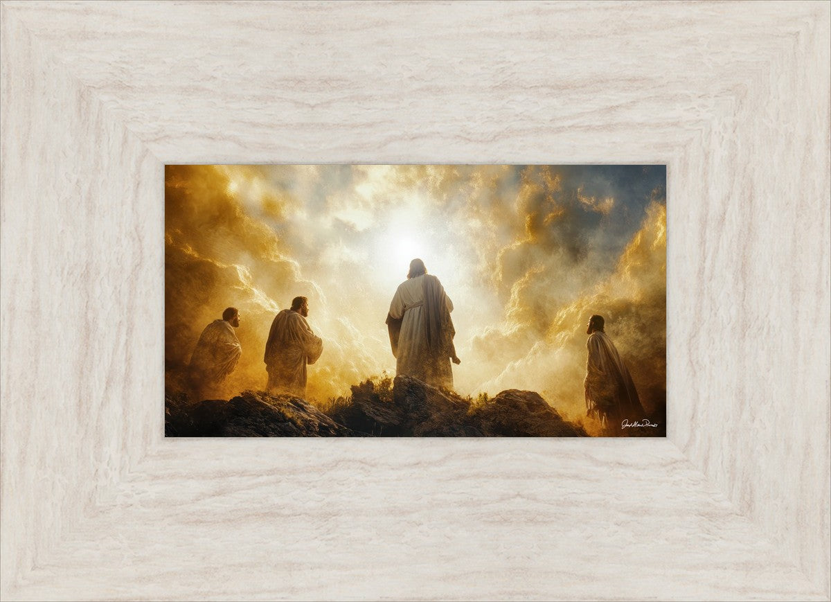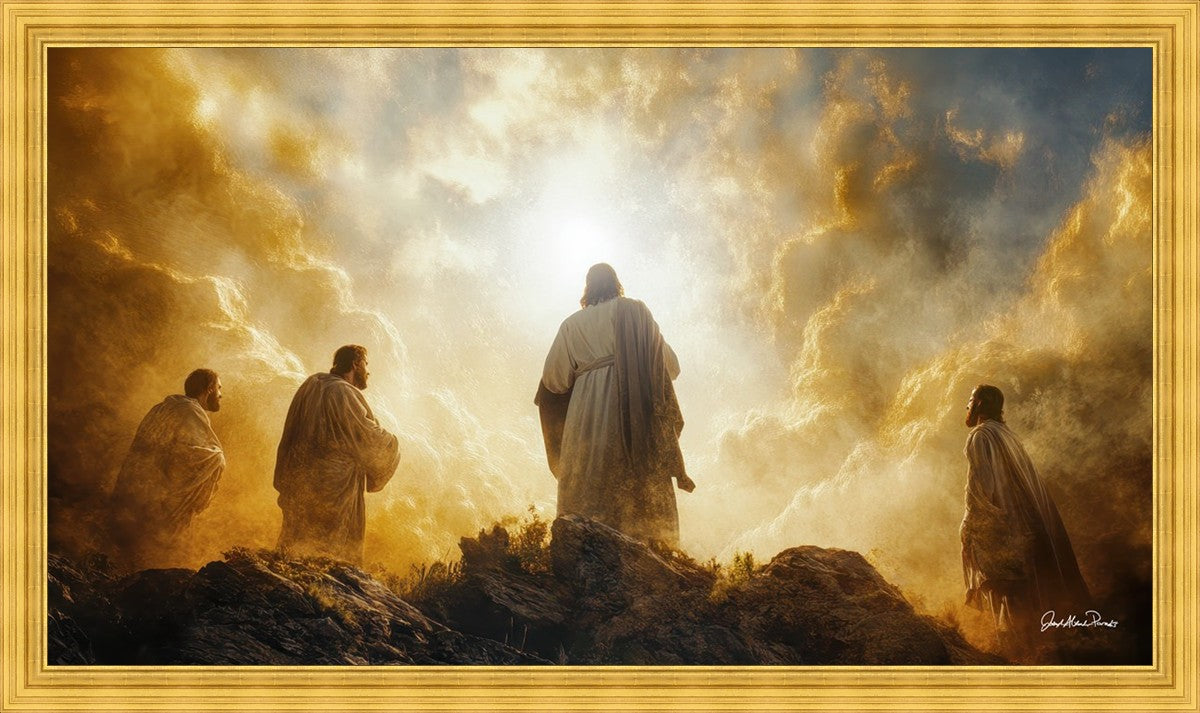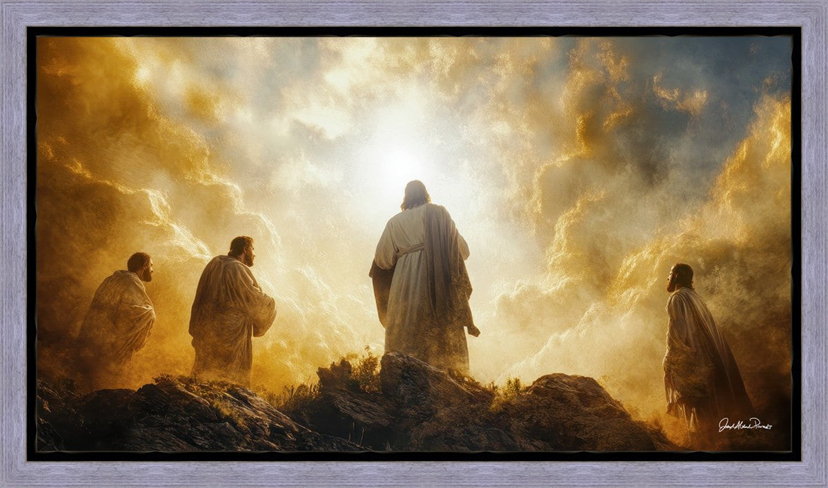 Imagine being witness to the Mount of Transfiguration, and the wonders that you might have beheld. It is said in the scriptures that Peter, James and John were so amazed by what they saw and heard, that they fell on their face. This artwork presents an upward looking perspective of reverence for the Lord and His power.