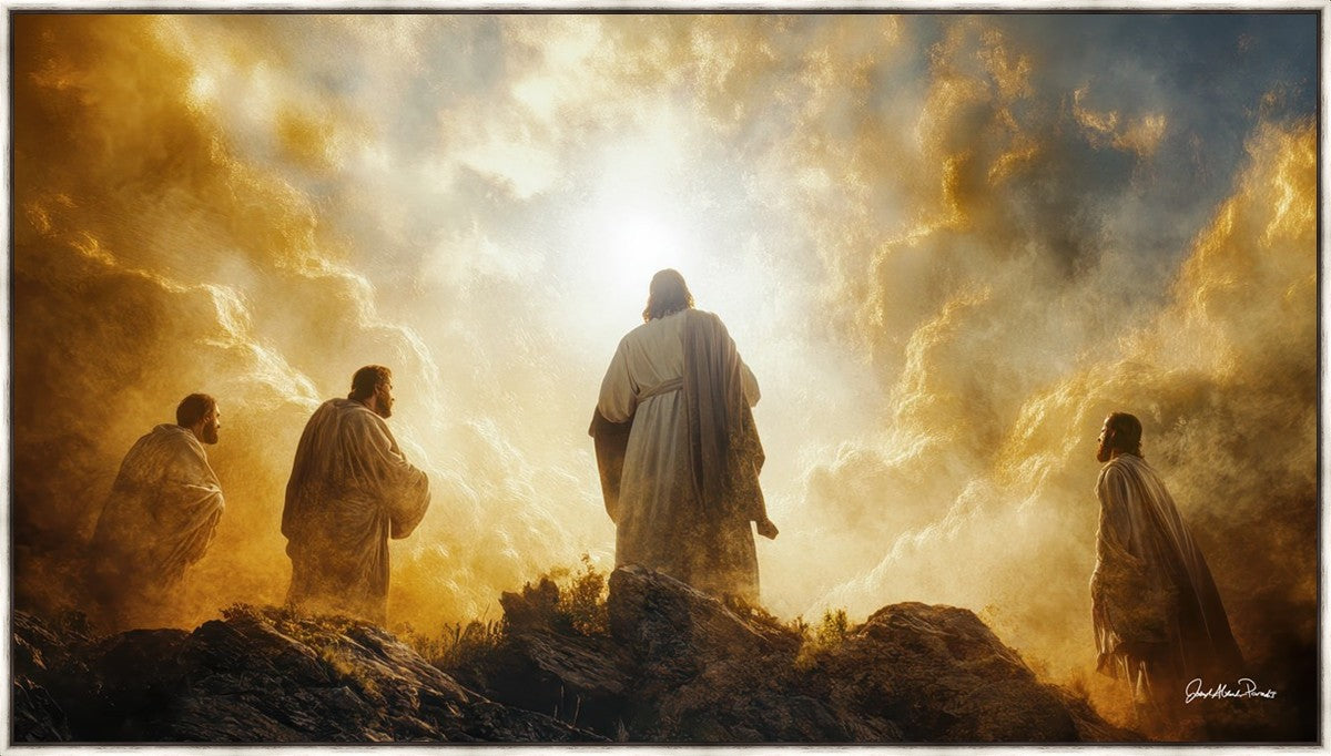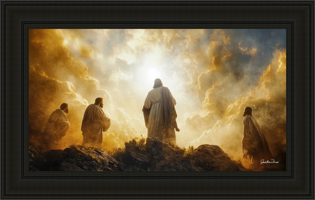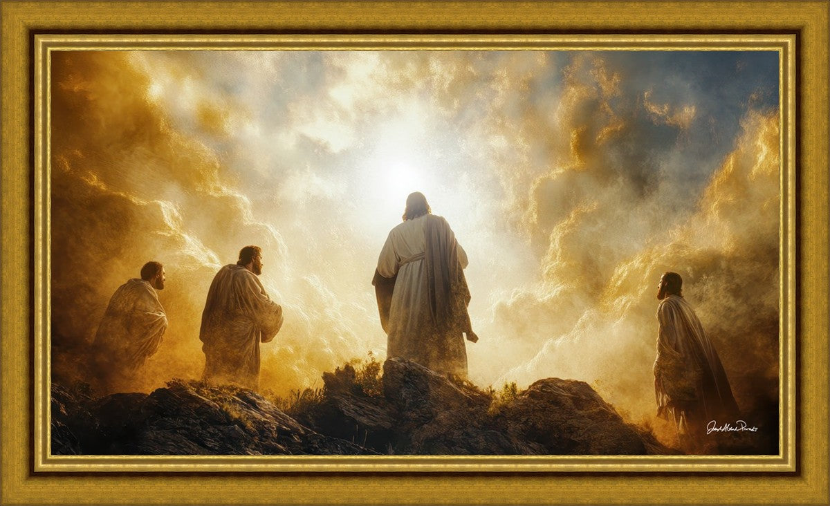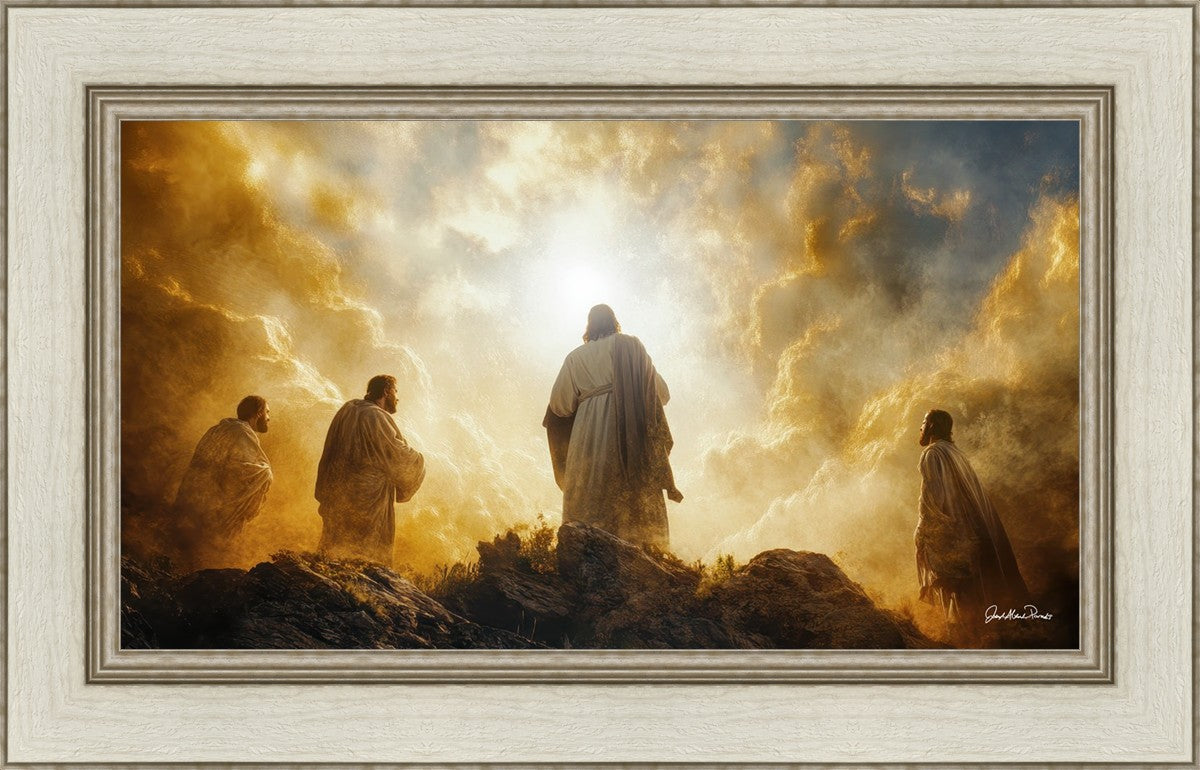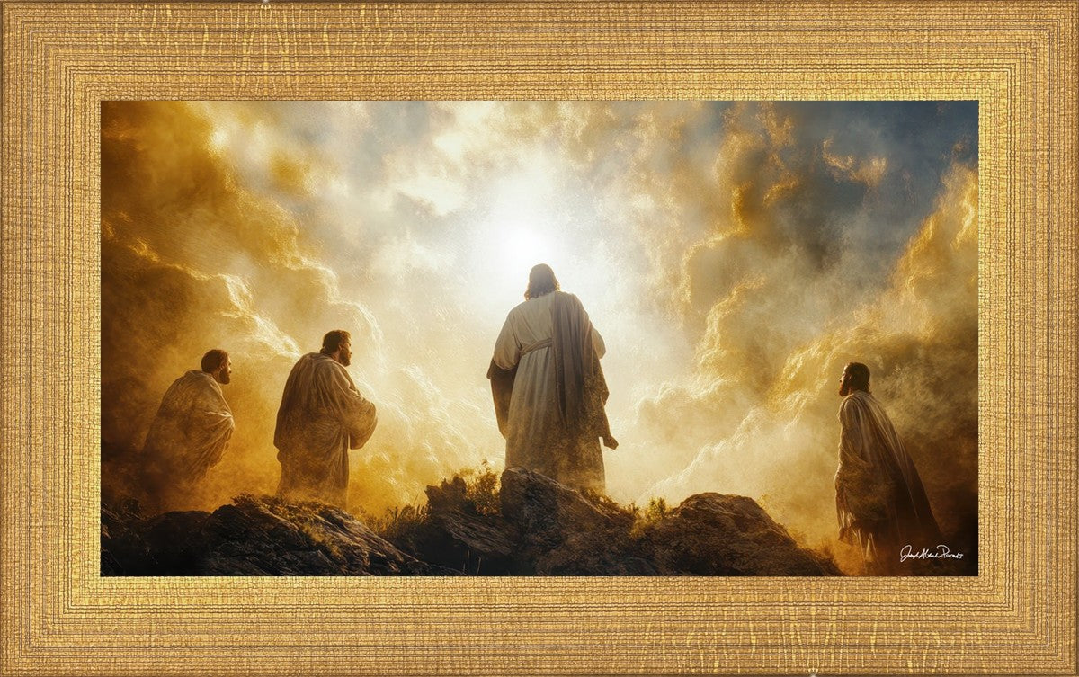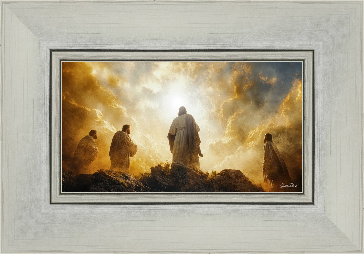 Imagine being witness to the Mount of Transfiguration, and the wonders that you might have beheld. It is said in the scriptures that Peter, James and John were so amazed by what they saw and heard, that they fell on their face. This artwork presents an upward looking perspective of reverence for the Lord and His power.