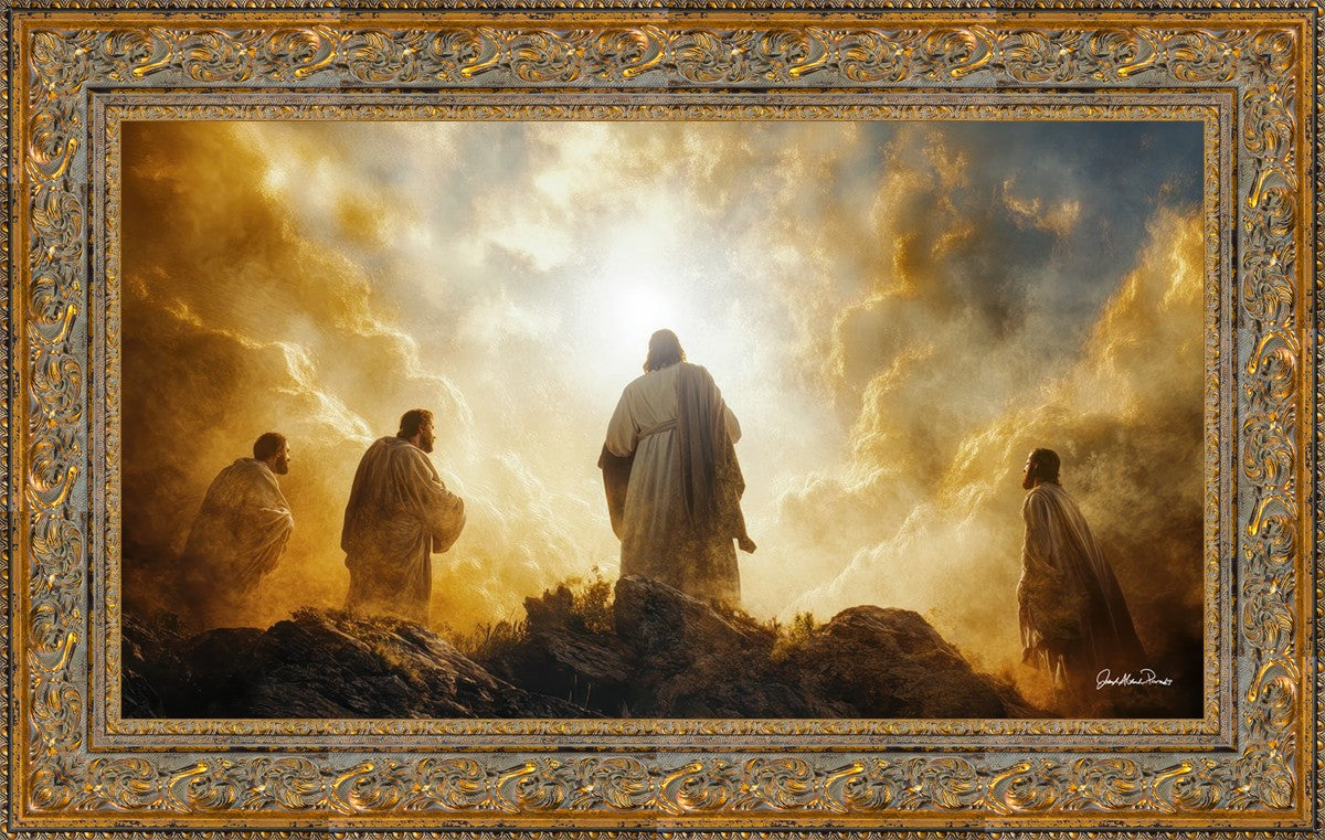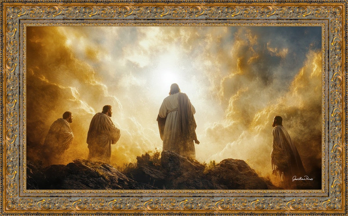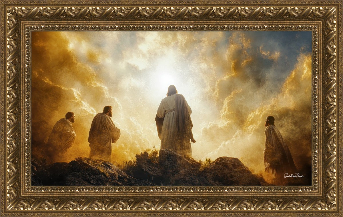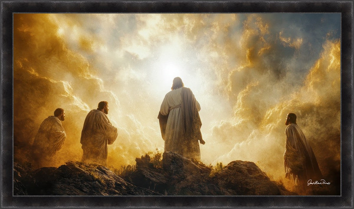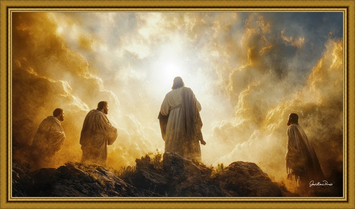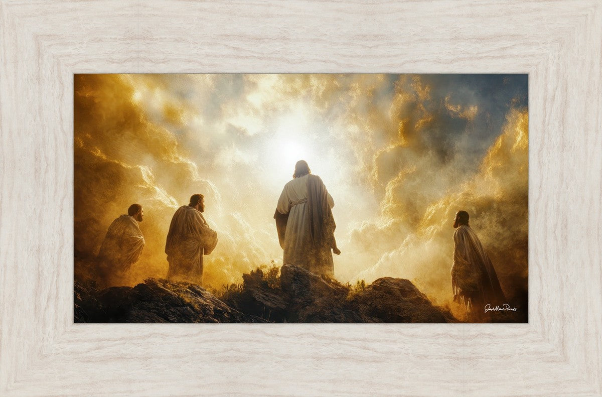 Imagine being witness to the Mount of Transfiguration, and the wonders that you might have beheld. It is said in the scriptures that Peter, James and John were so amazed by what they saw and heard, that they fell on their face. This artwork presents an upward looking perspective of reverence for the Lord and His power.