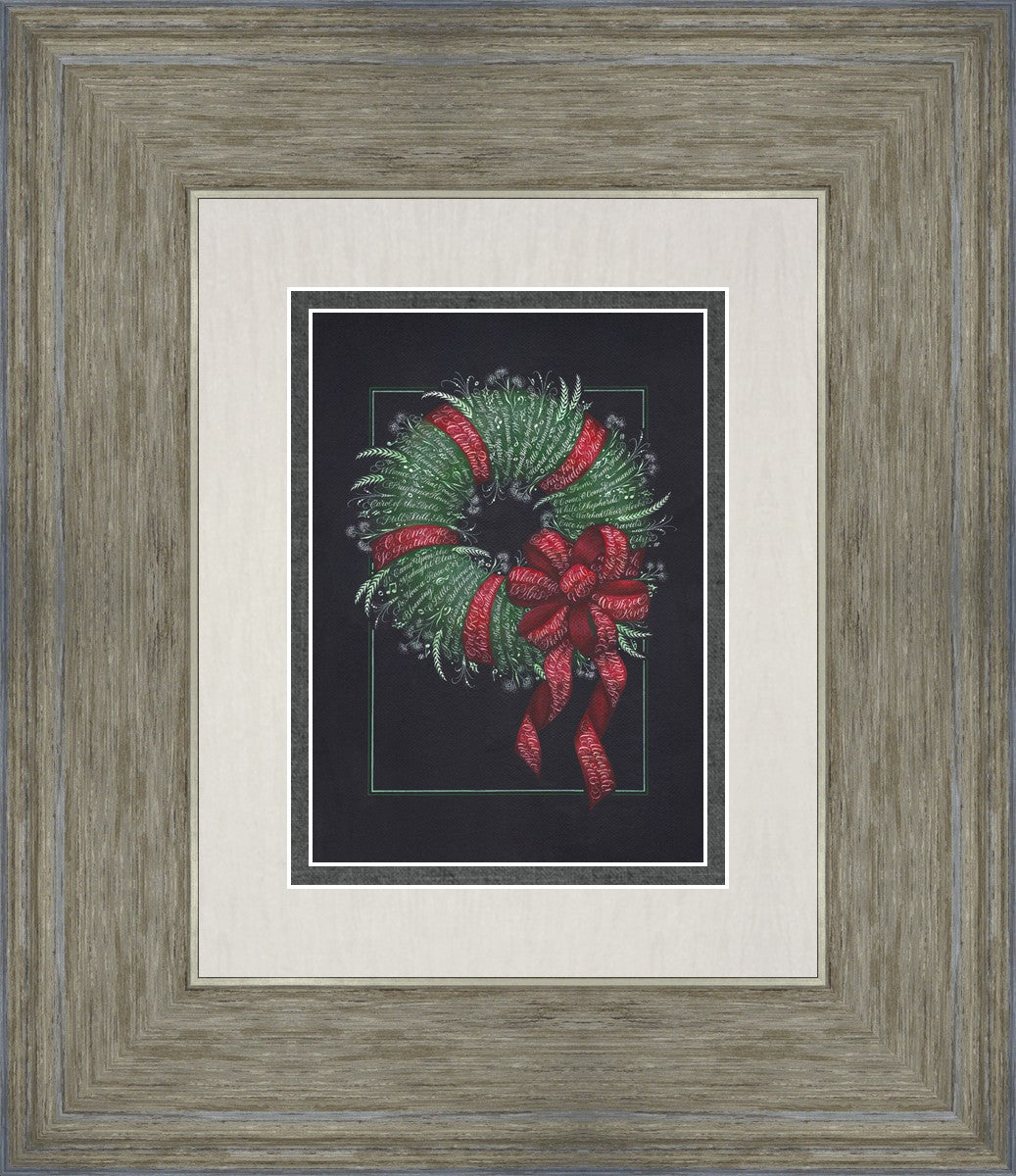 I wondered about elevating the whole design by making the wreath look dimensional and decided to initially lay down some watercolor to help the donut shape look rounded. My paper was not the right kind for so much water and it buckled. I decided to continue my experiment anyway. Once the words were on, I strengthened the shadow areas with colored pencil. With some heat and pressure, we eventually got the ripples out.