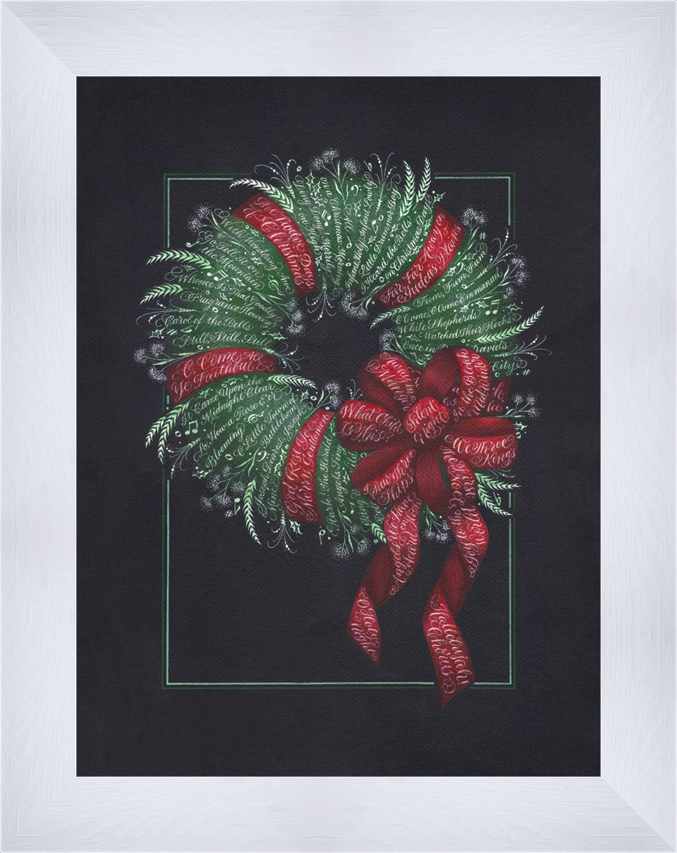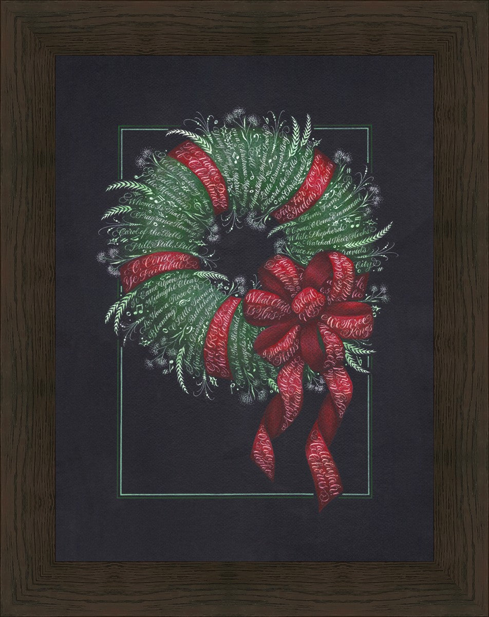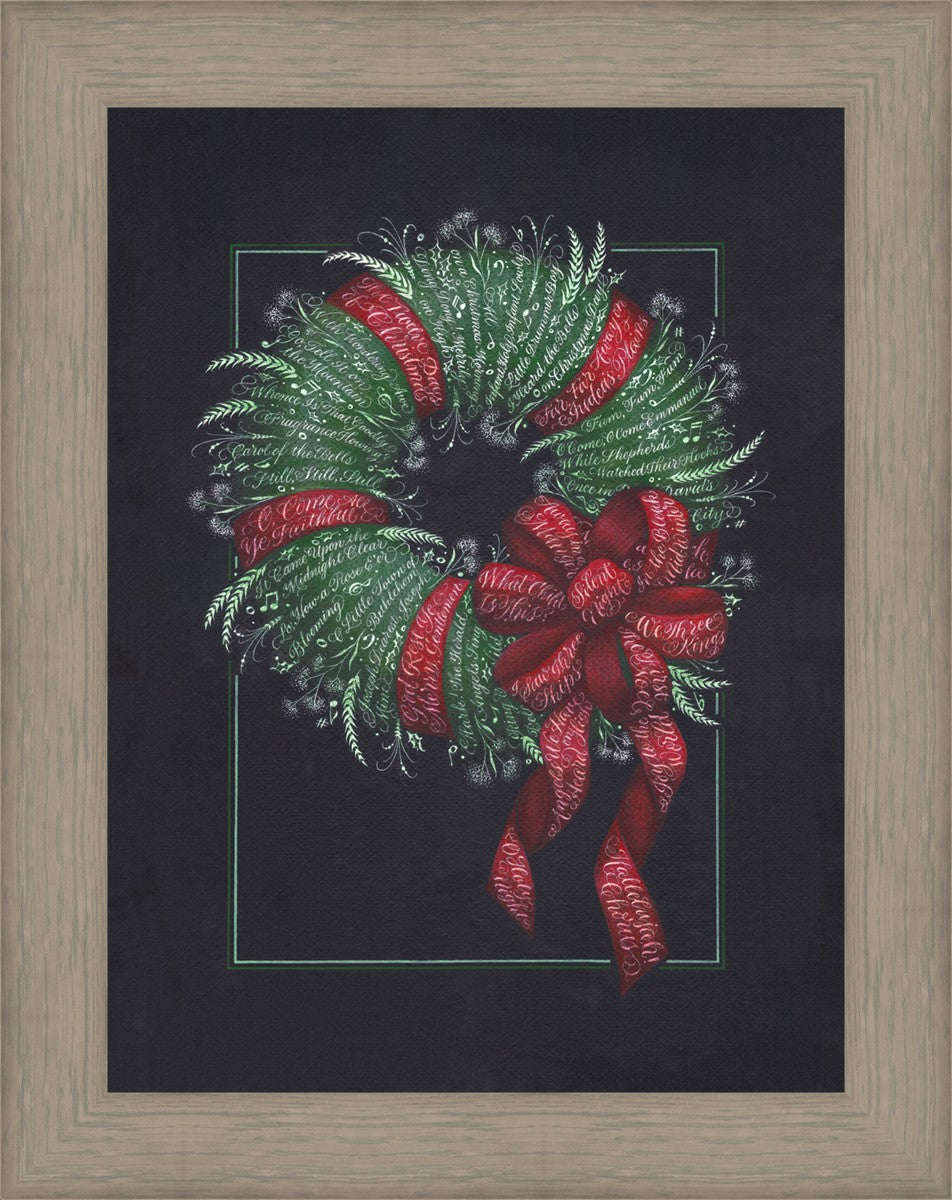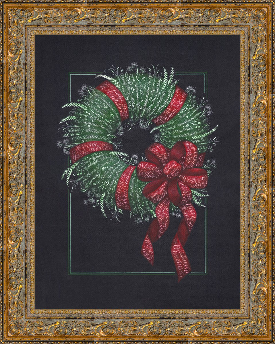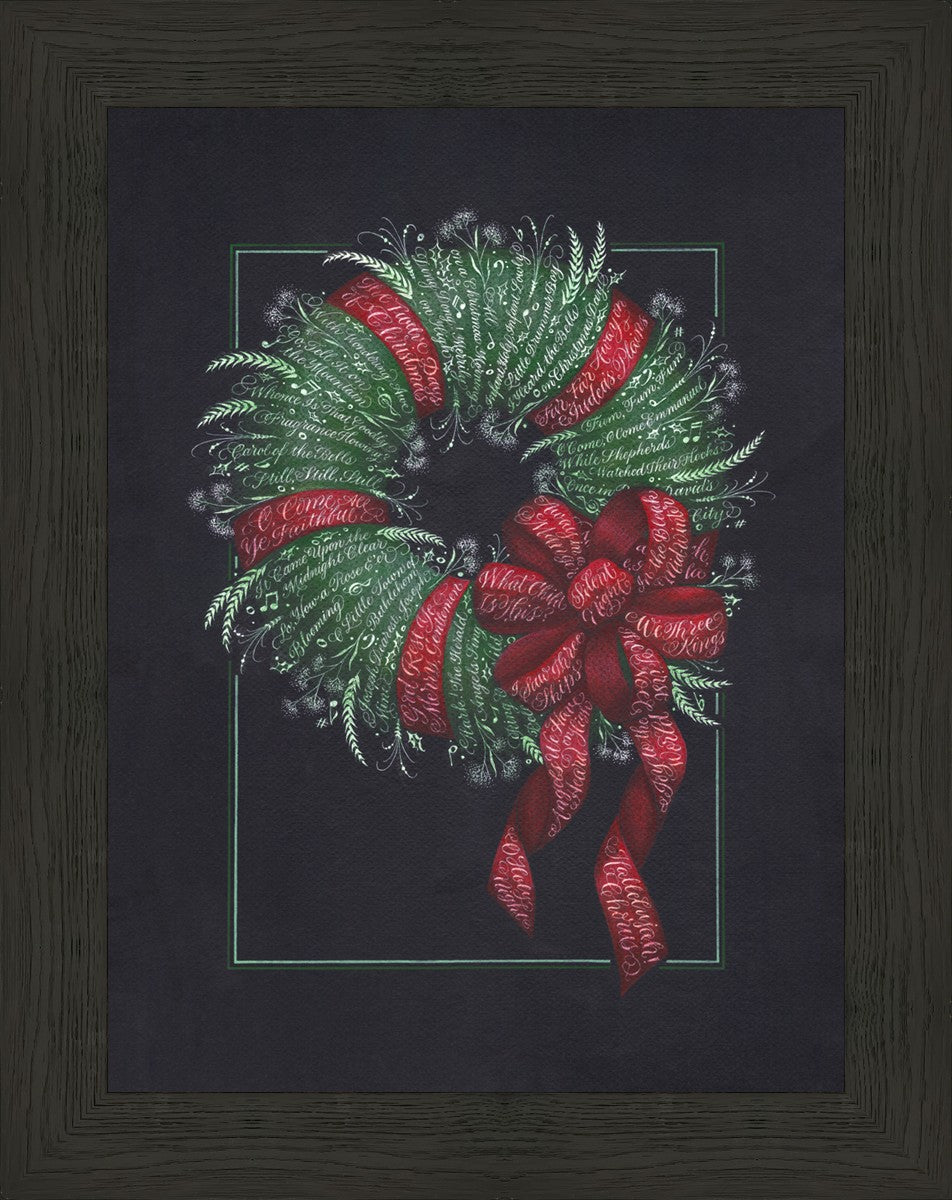 I was sketching during October General Conference, about the time of year I start thinking of Christmas things, and landed on the idea of wreaths made up of words. I love Christmas carols and wondered how many I could fit in a wreath. I began planning out the pattern by tying a bow from wired ribbon, lighting it, and drawing it so I could get the loops and turns correct. I began positioning titles into the ribbon spaces and then into the wreath.