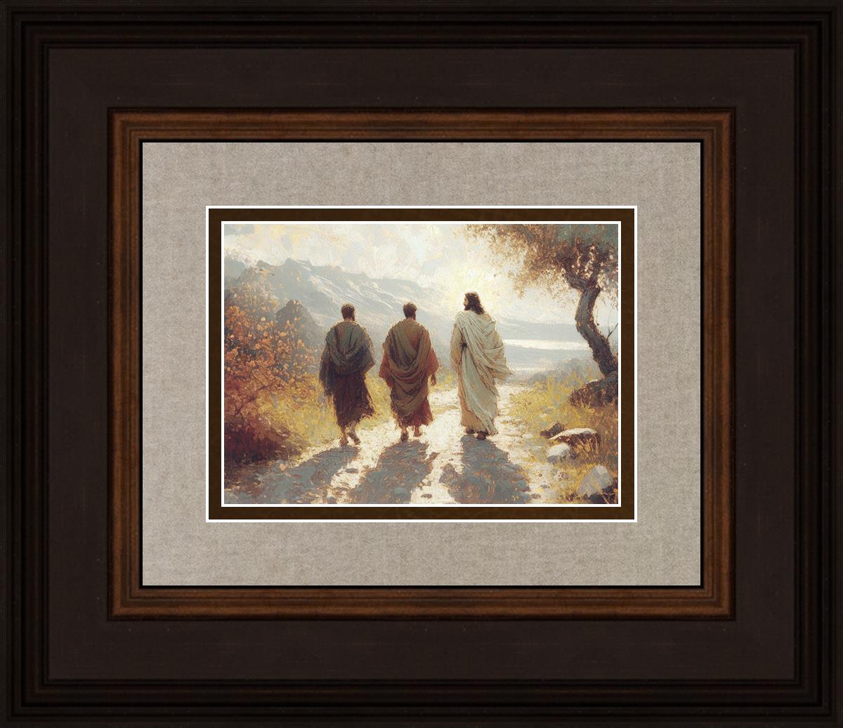 In the ancient land of Judea, two saddened disciples traveled from Jerusalem to Emmaus. They were distraught over Jesus' crucifixion and confused by reports of his resurrection. Along the dusty road, a stranger joined them—Jesus, though they didn't recognize him.