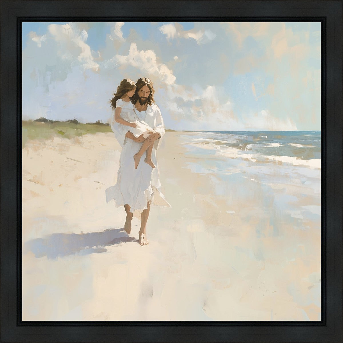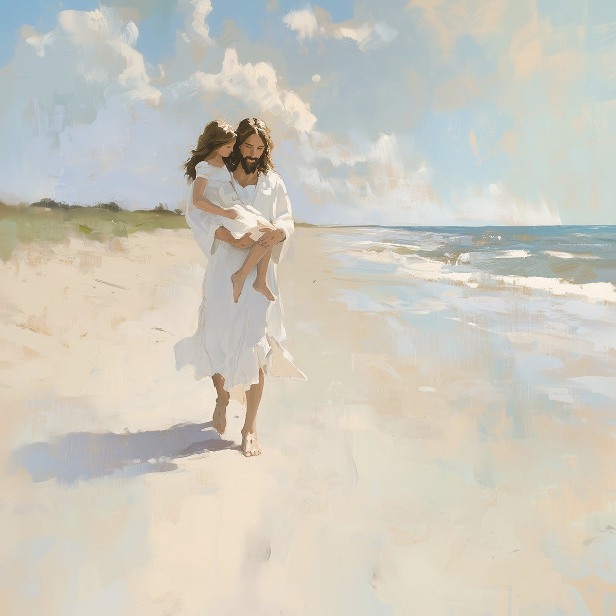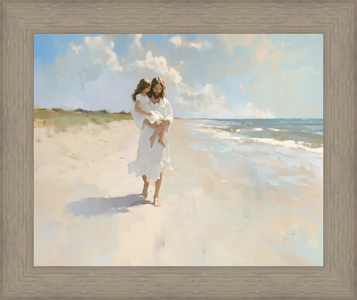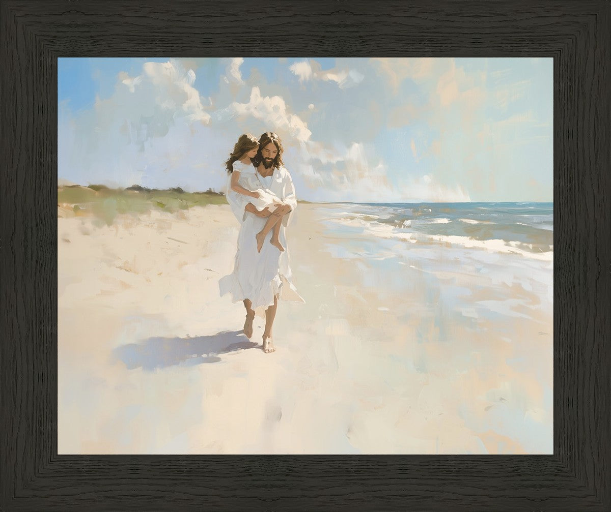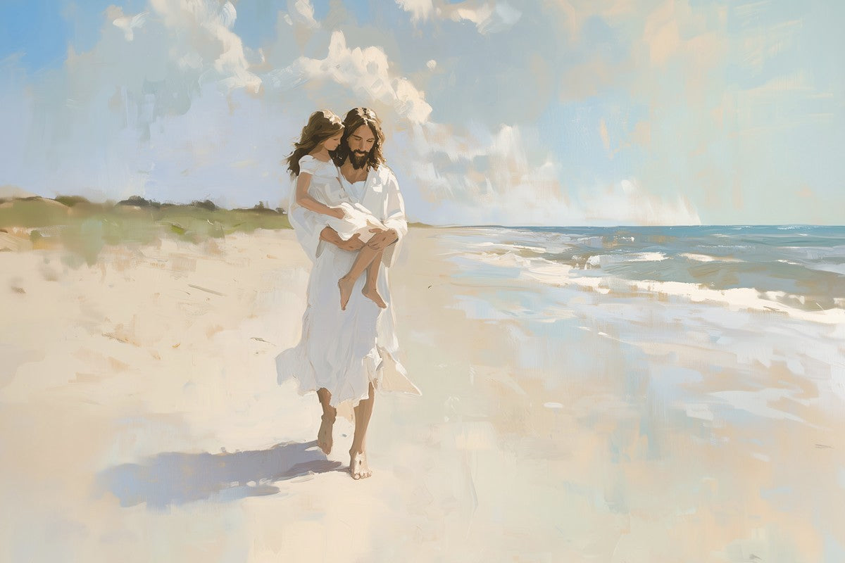 There are times when the sands of life feel unsteady beneath our feet, and the weight of our struggles threatens to overwhelm us. Yet, just as He carries this child with strength and grace, Christ lifts us up when we can’t take another step. Psalm 119:105 reminds us, “Thy word is a lamp unto my feet, and a light unto my path.” His light guides us, and His arms hold us, no matter how turbulent life becomes. Let this image fill your heart with peace, knowing that Christ walks beside you, ready to carry you through every trial.
