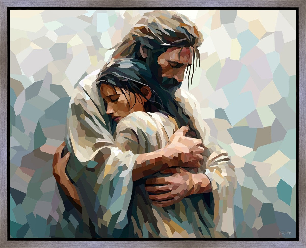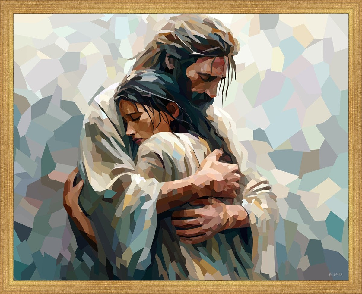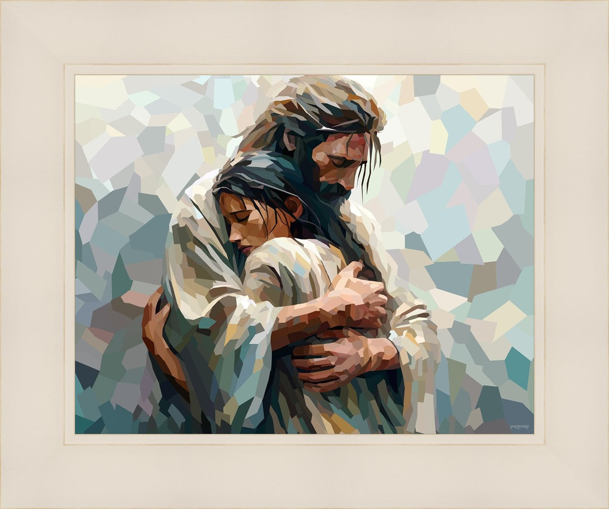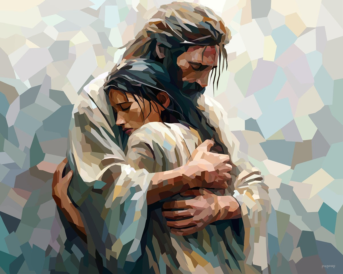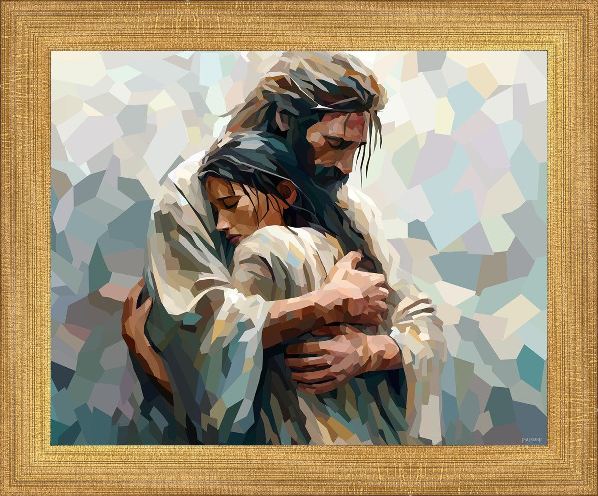 In this particular piece, a woman is embraced by Christ who not only perfectly understands, but perfectly feels every experience (generic or unique) that she has felt.