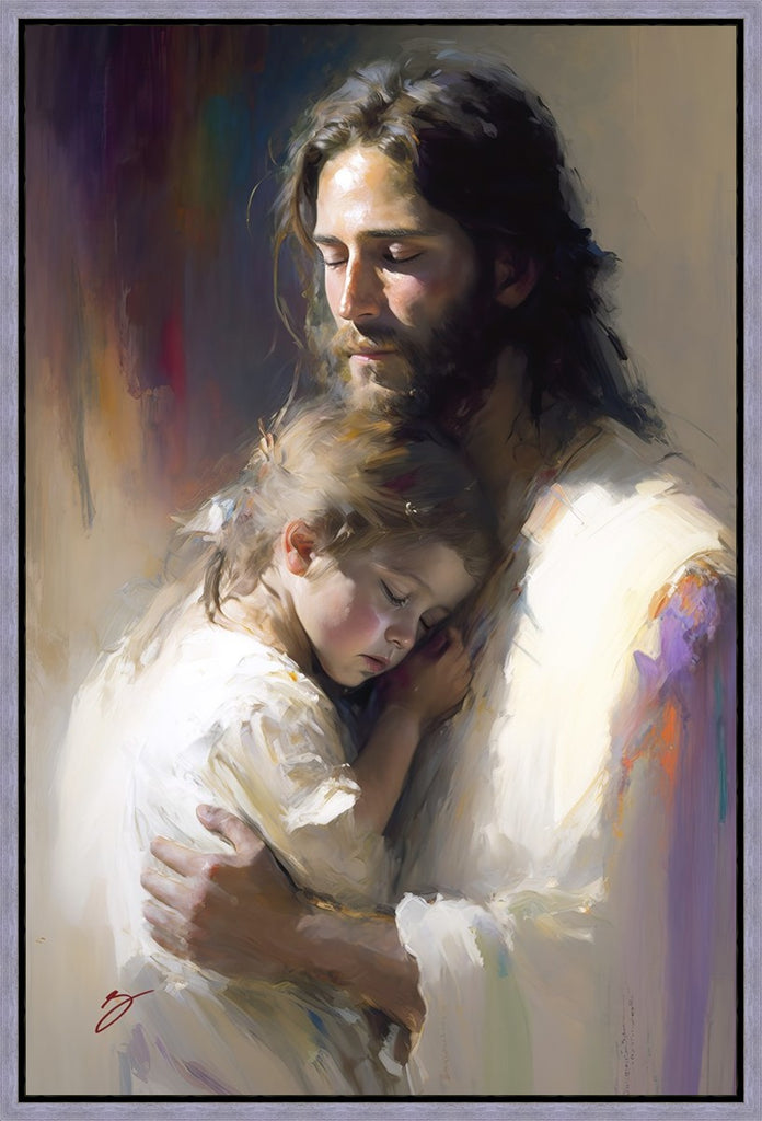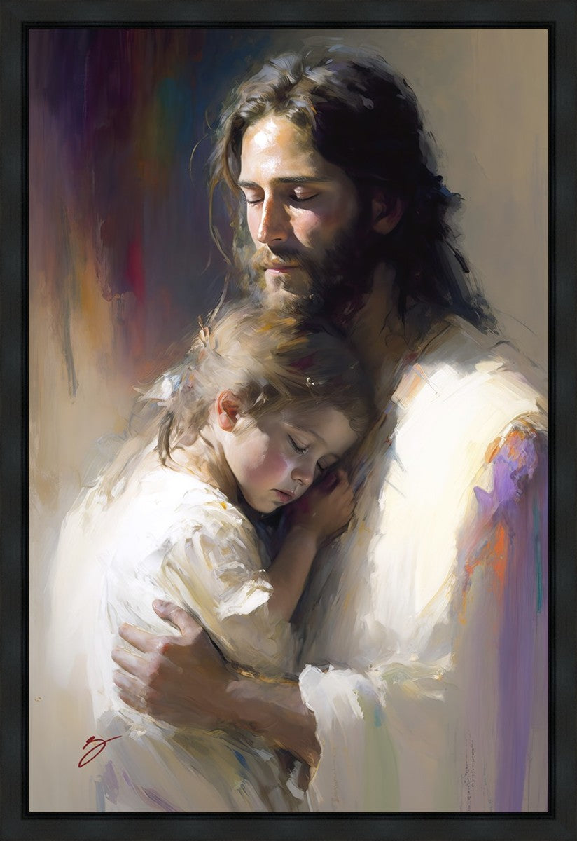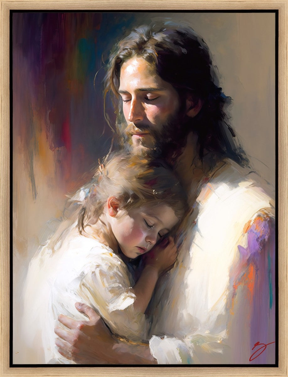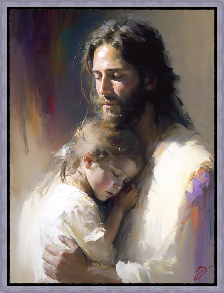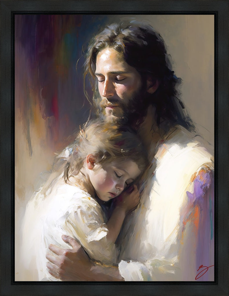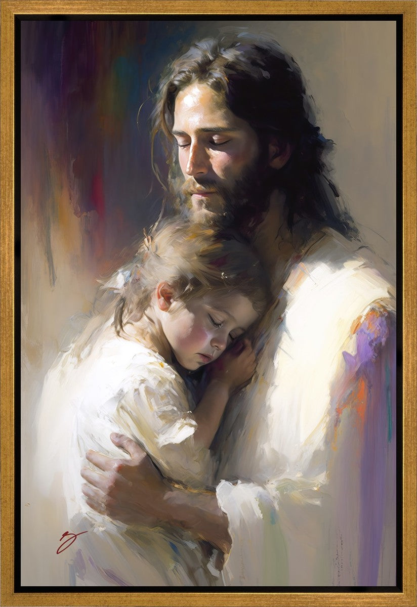 "Comfort the Children" is not just a painting, but a visual embodiment of love and compassion. It portrays Jesus Christ, the savior of humanity, holding a small child against his chest. The child is crying, feeling sad and hurt, but in the arms of the savior, she finds peace and comfort. Both Jesus and the child have their eyes closed, lost in the moment of love and healing. The painting is done in a soothing earth-tone color scheme with splashes of color, creating a serene and calming ambiance.