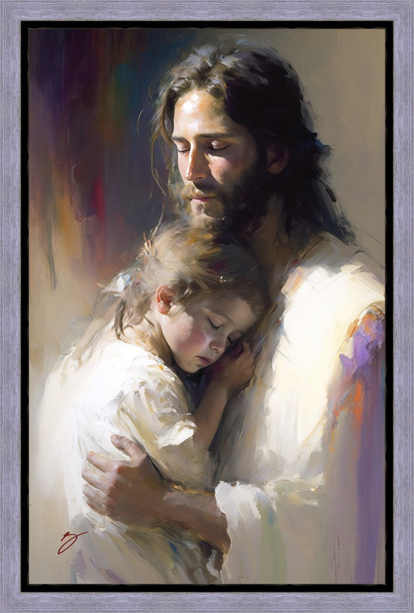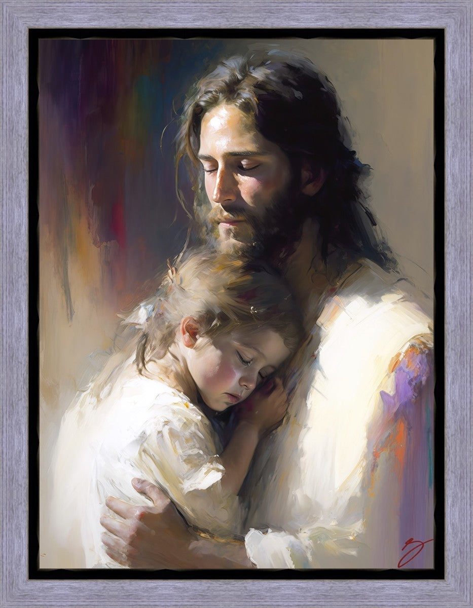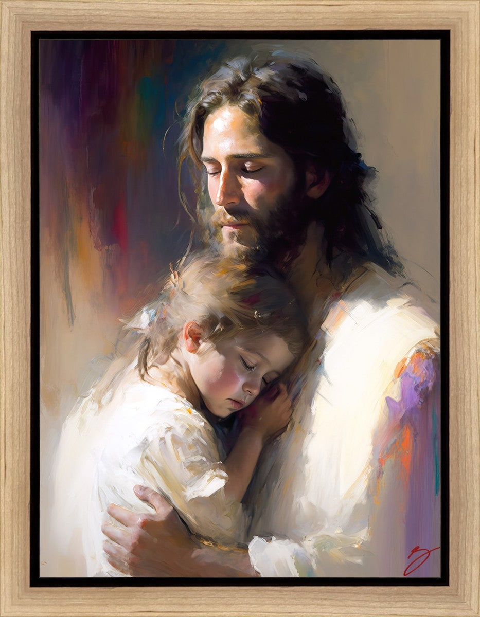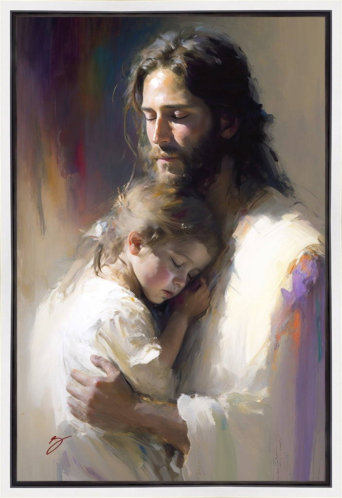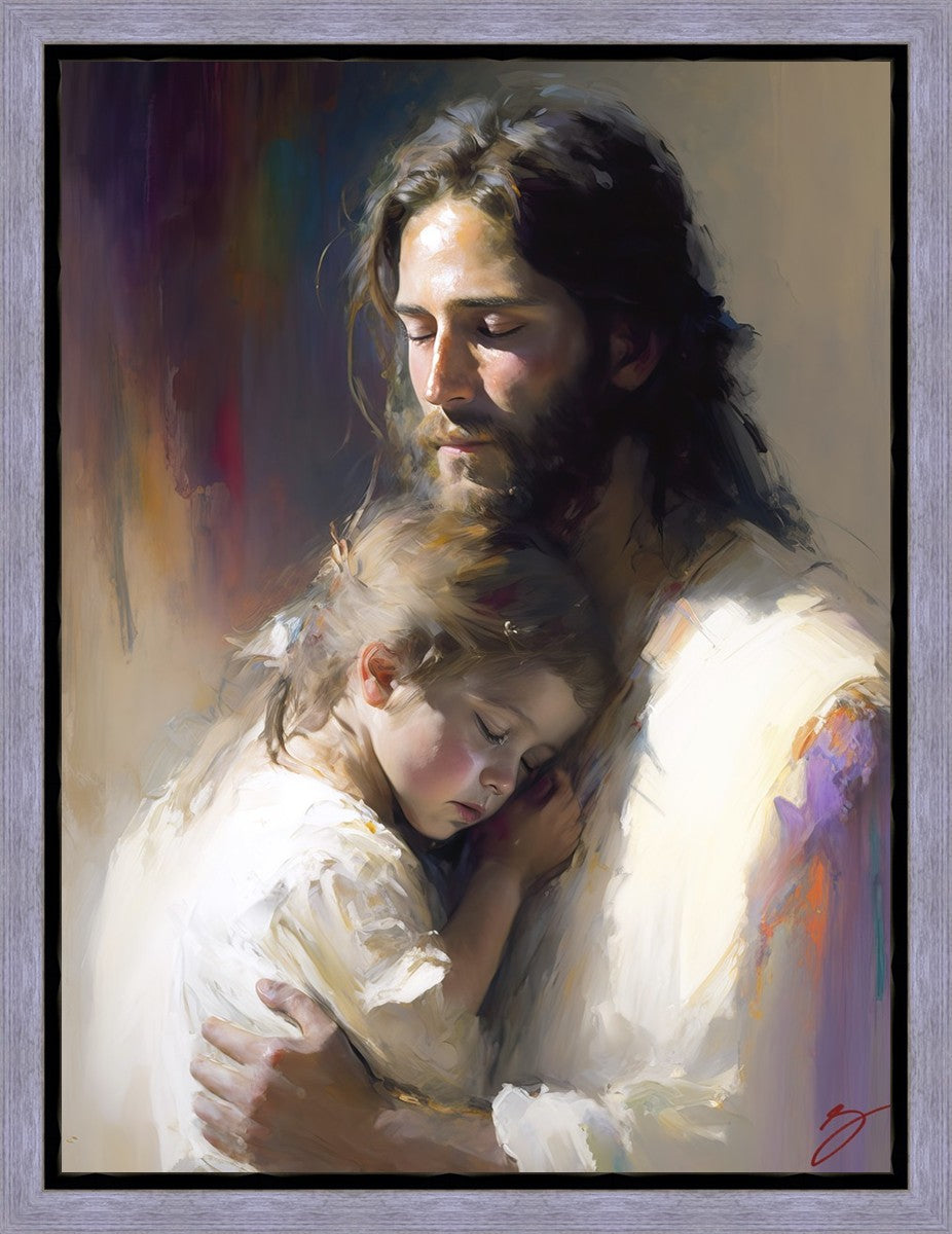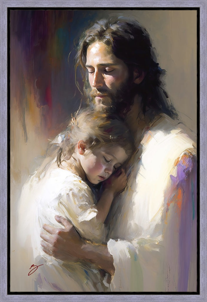 "Comfort the Children" is not just a painting, but a visual embodiment of love and compassion. It portrays Jesus Christ, the savior of humanity, holding a small child against his chest. The child is crying, feeling sad and hurt, but in the arms of the savior, she finds peace and comfort. Both Jesus and the child have their eyes closed, lost in the moment of love and healing. The painting is done in a soothing earth-tone color scheme with splashes of color, creating a serene and calming ambiance.