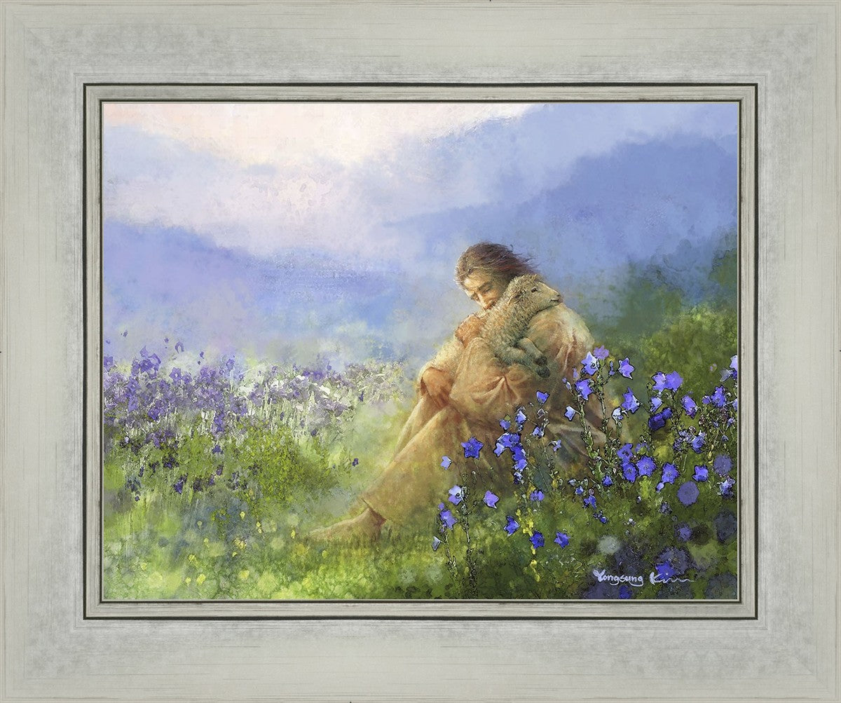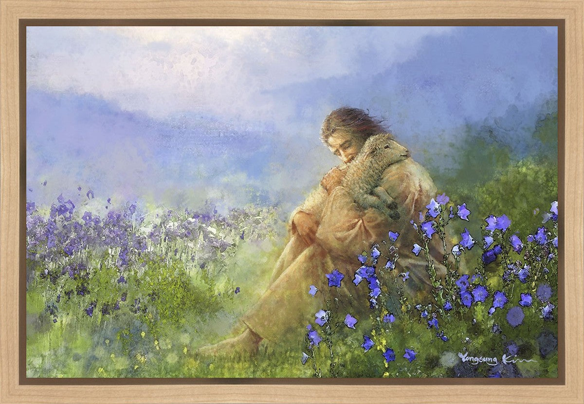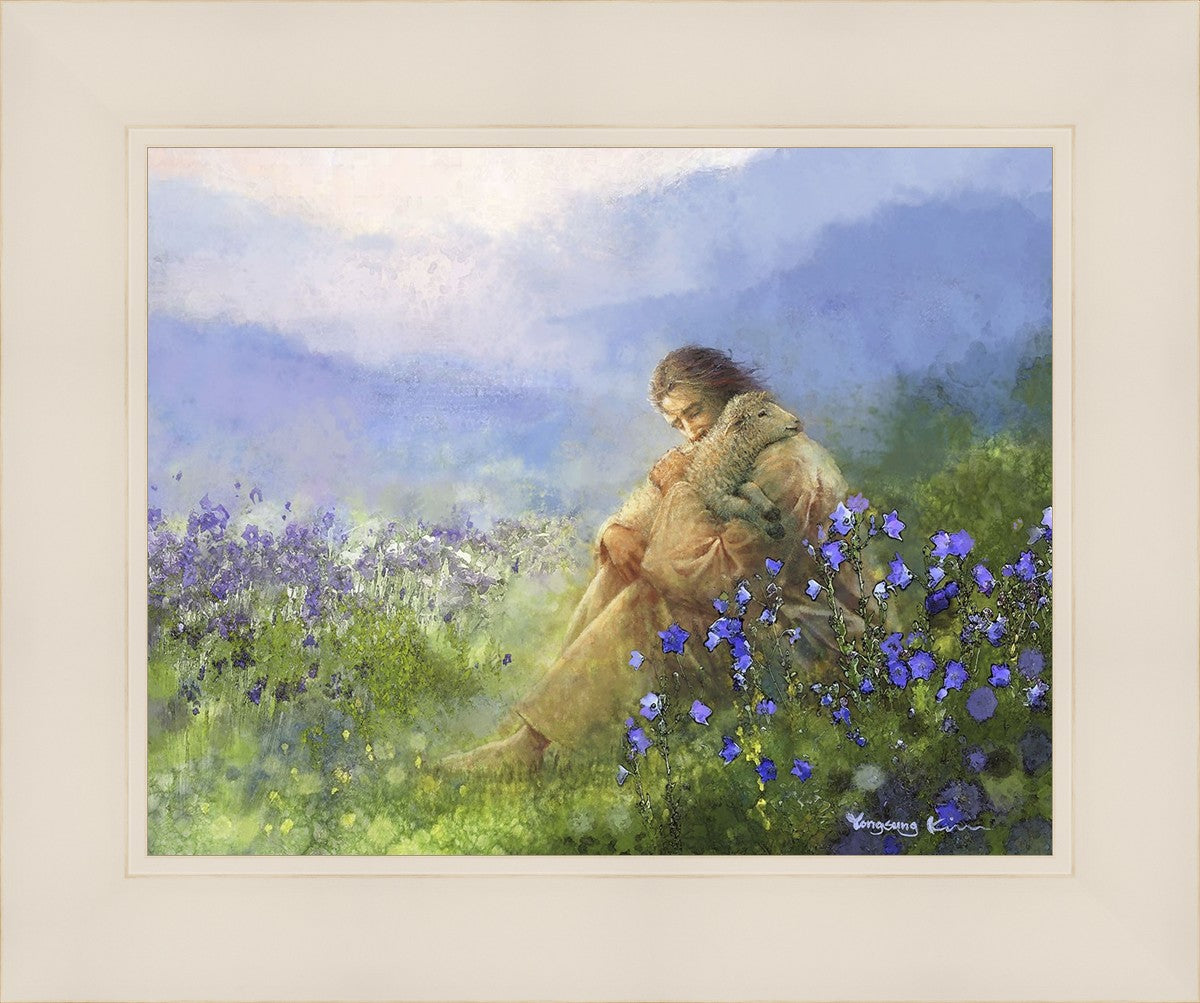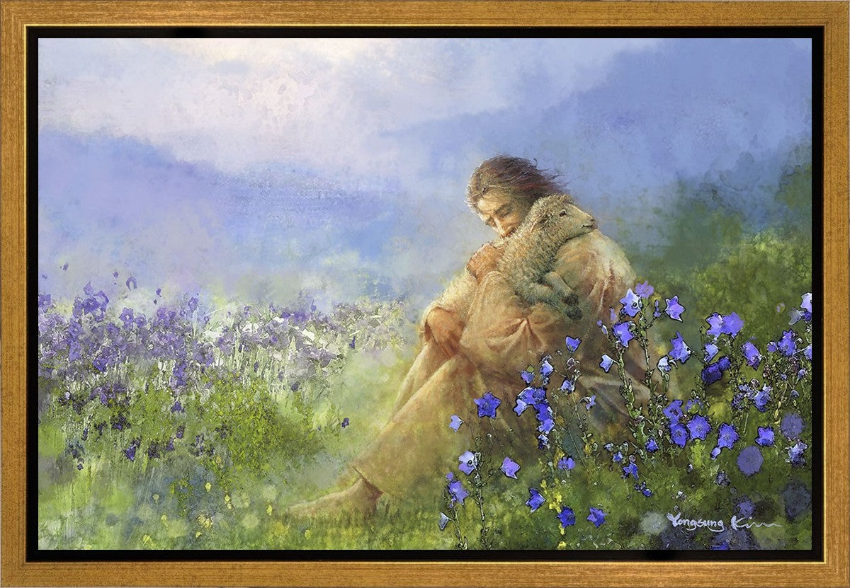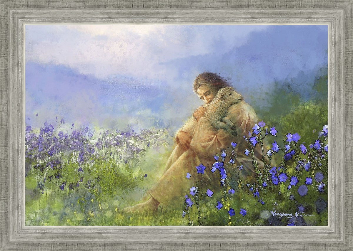 "Comforter" by Yongsung Kim portrays Jesus Christ tenderly embracing a lamb amidst a serene field of purple flowers beneath a calming blue sky, emanating divine comfort and compassion. This touching artwork evokes feelings of solace and compassion, resonating with viewers seeking spiritual reassurance and a deeper connection to their faith.