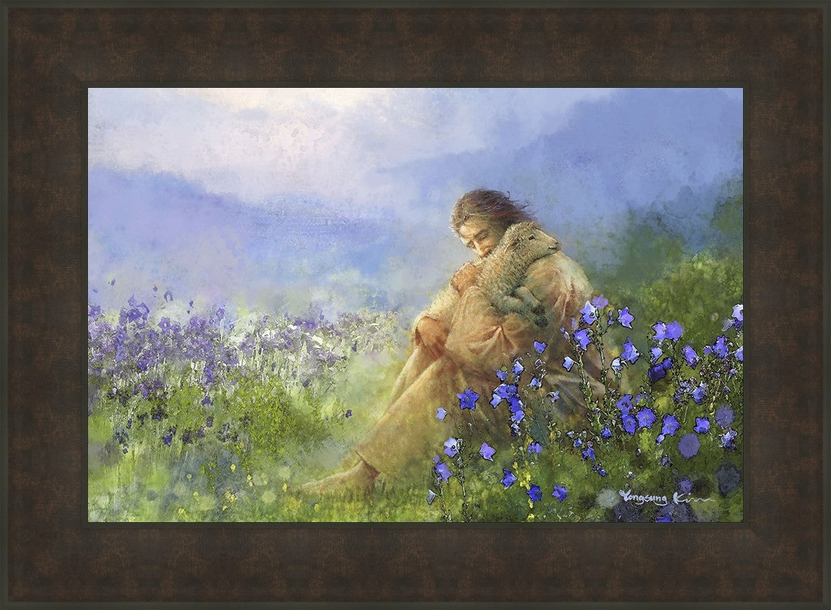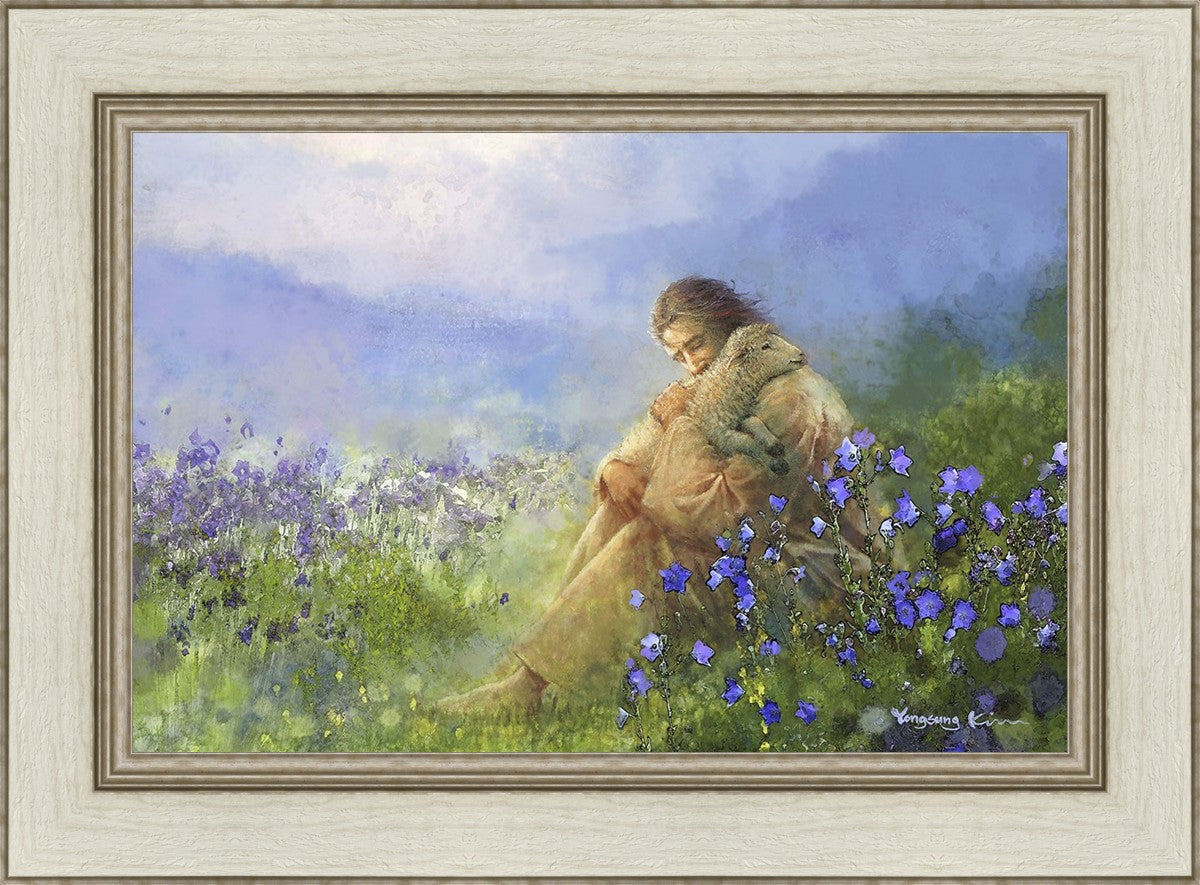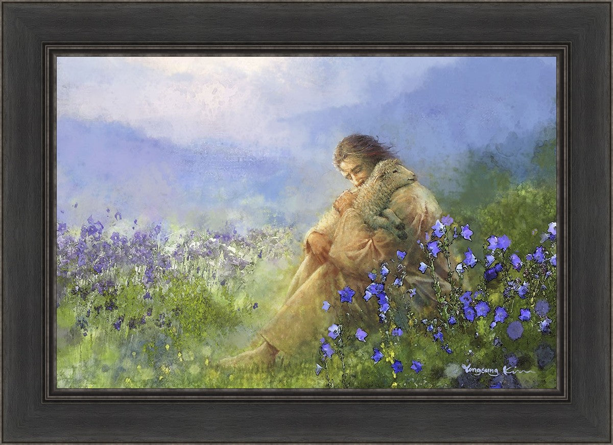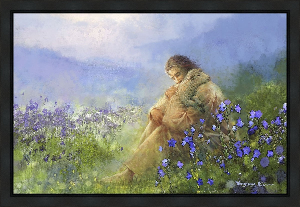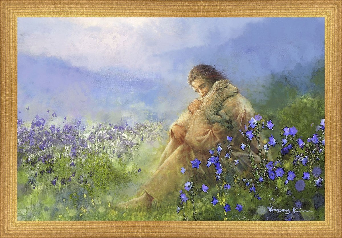 "Comforter" by Yongsung Kim portrays Jesus Christ tenderly embracing a lamb amidst a serene field of purple flowers beneath a calming blue sky, emanating divine comfort and compassion. This touching artwork evokes feelings of solace and compassion, resonating with viewers seeking spiritual reassurance and a deeper connection to their faith.