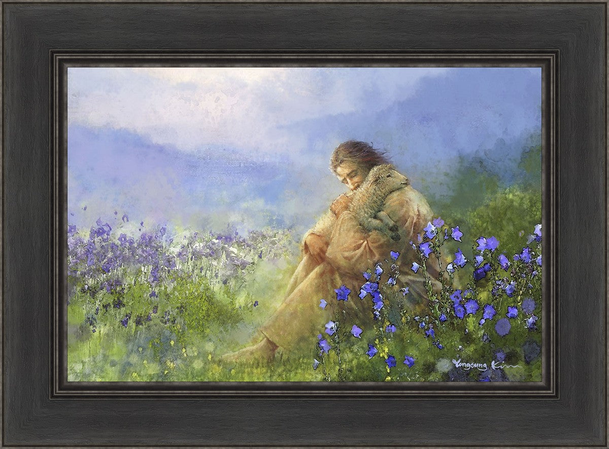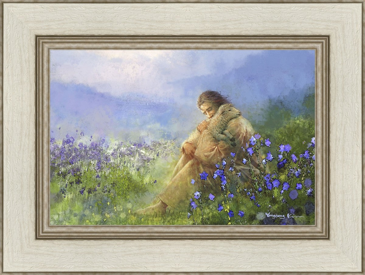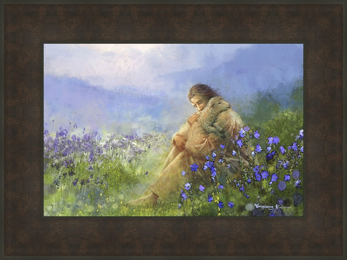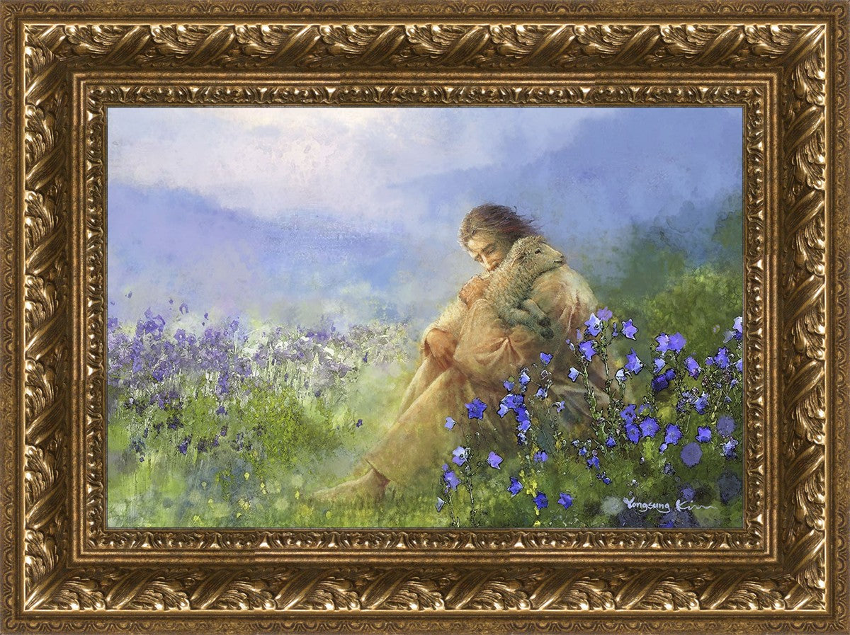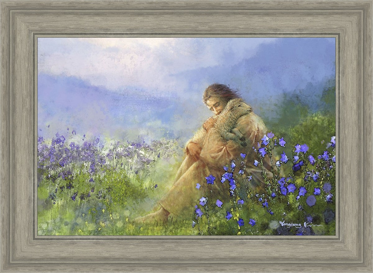"Comforter" by Yongsung Kim portrays Jesus Christ tenderly embracing a lamb amidst a serene field of purple flowers beneath a calming blue sky, emanating divine comfort and compassion. This touching artwork evokes feelings of solace and compassion, resonating with viewers seeking spiritual reassurance and a deeper connection to their faith.