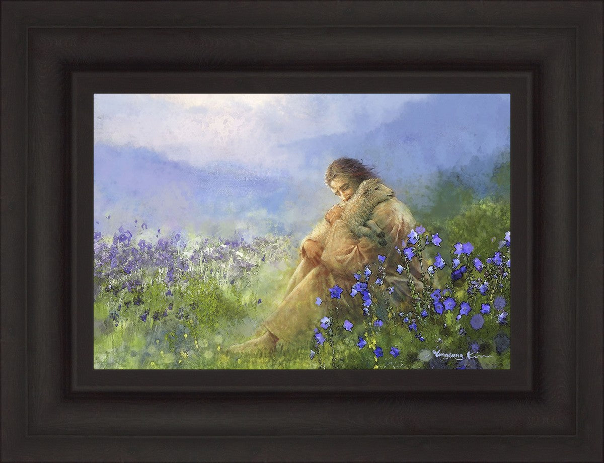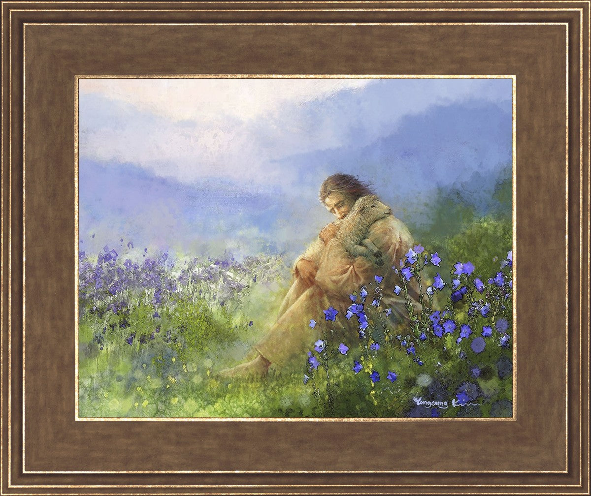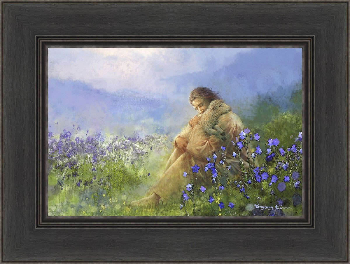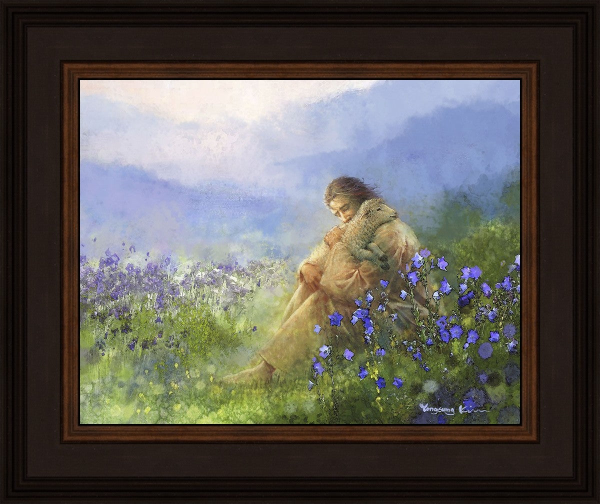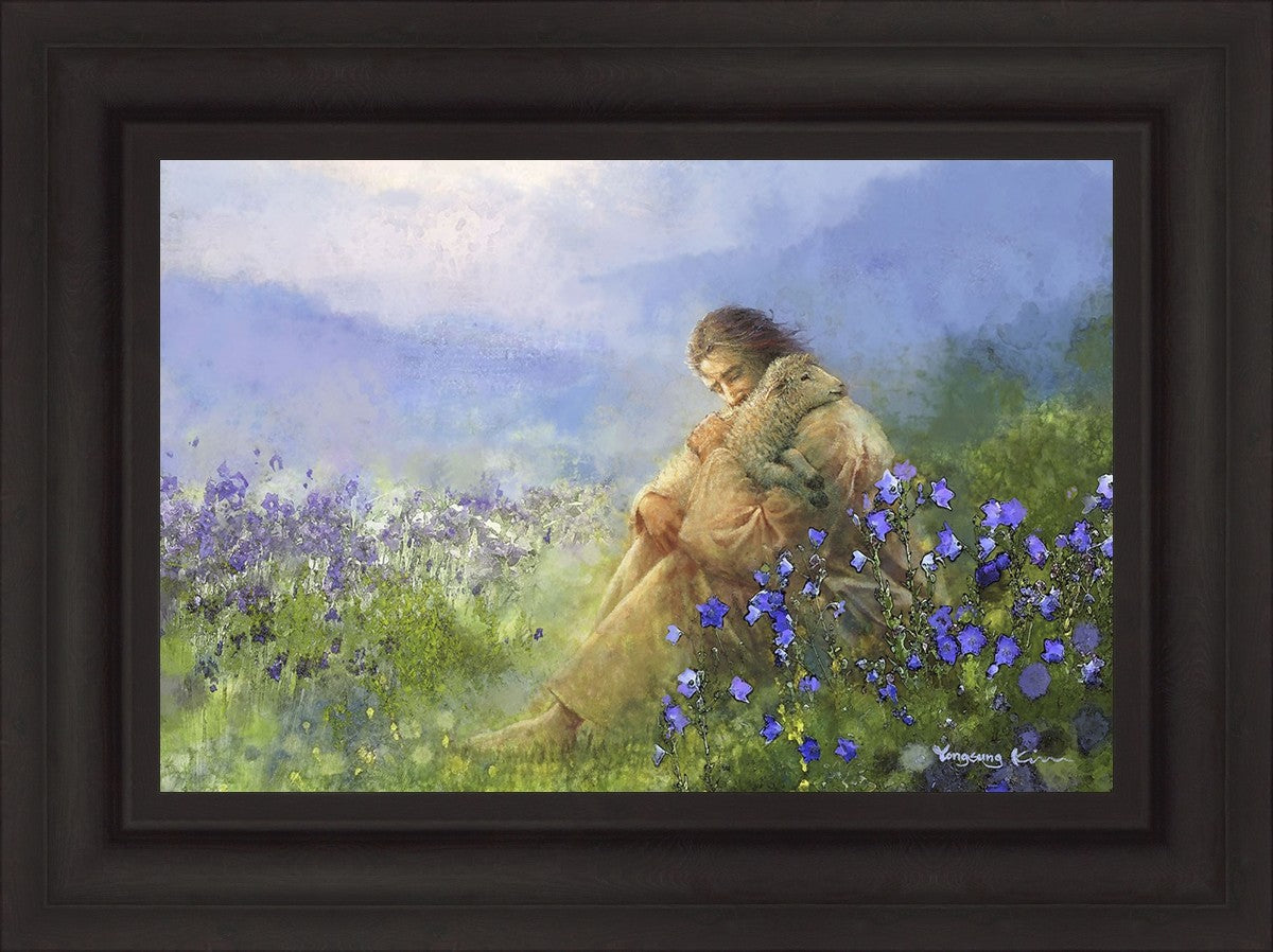 "Comforter" by Yongsung Kim portrays Jesus Christ tenderly embracing a lamb amidst a serene field of purple flowers beneath a calming blue sky, emanating divine comfort and compassion. This touching artwork evokes feelings of solace and compassion, resonating with viewers seeking spiritual reassurance and a deeper connection to their faith.