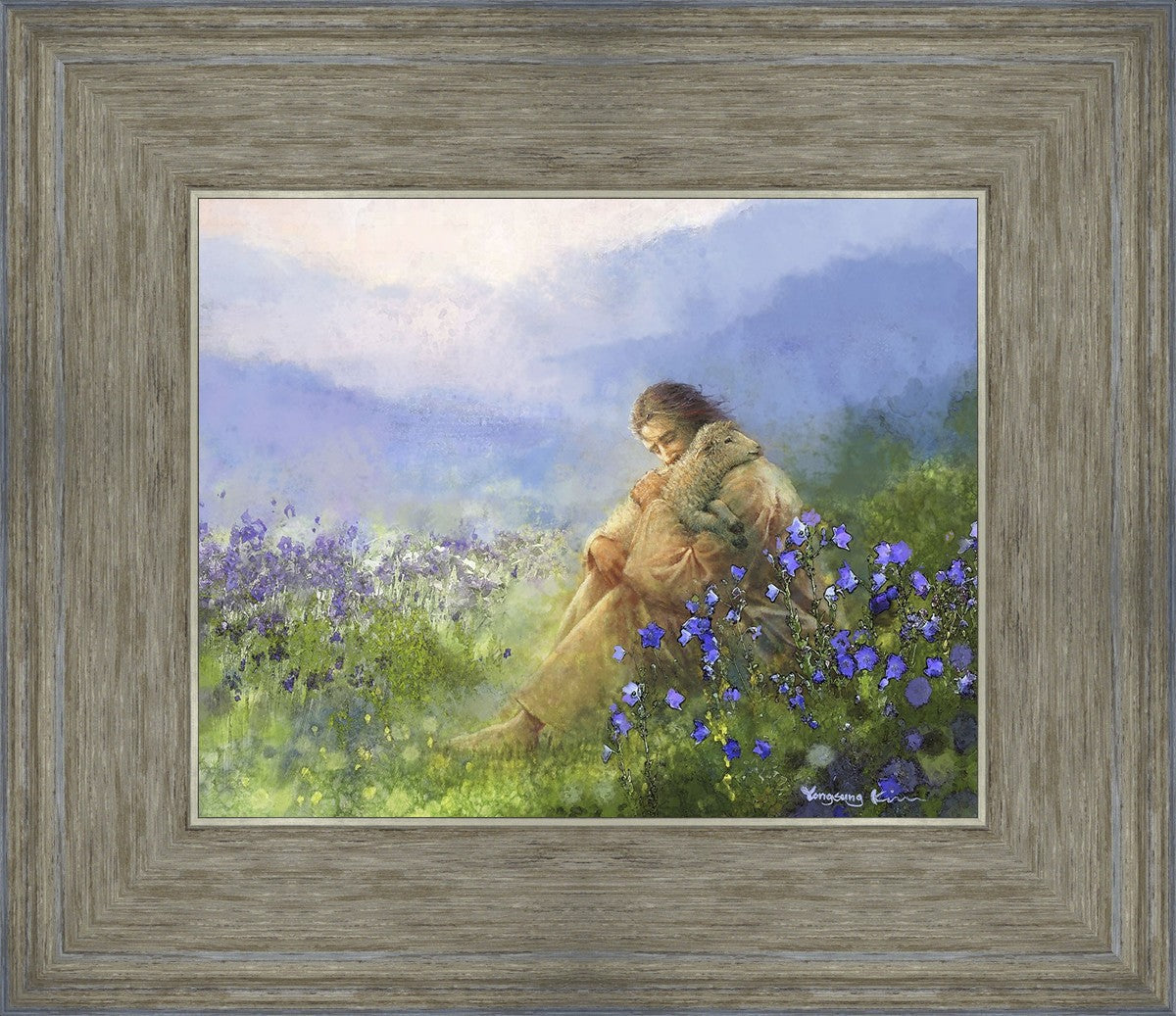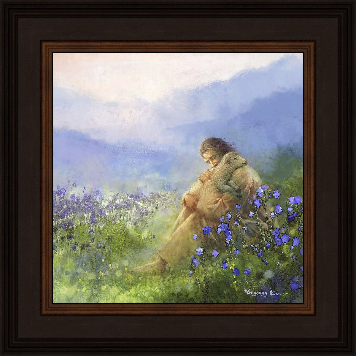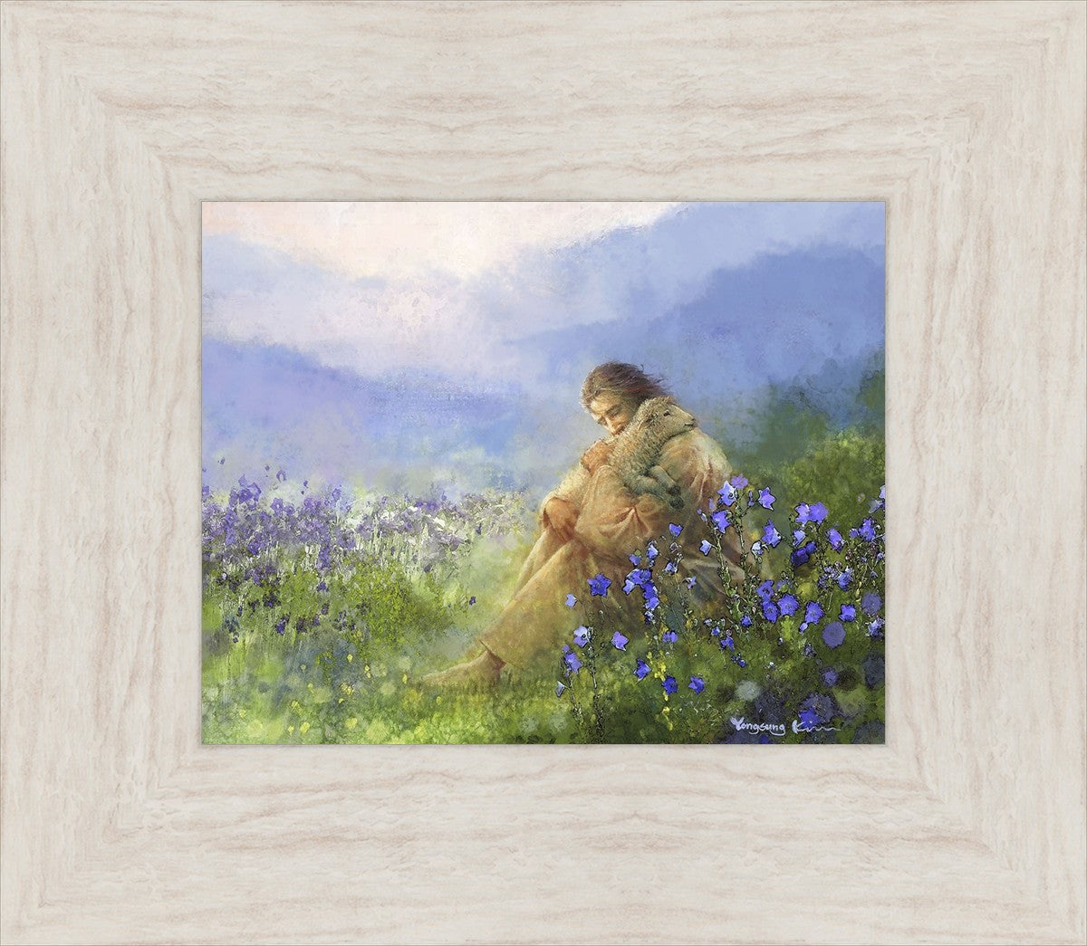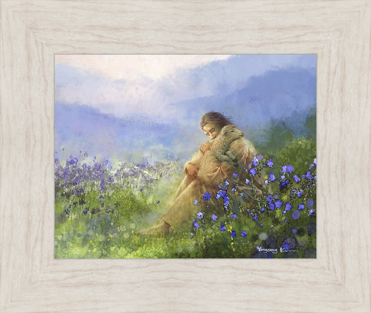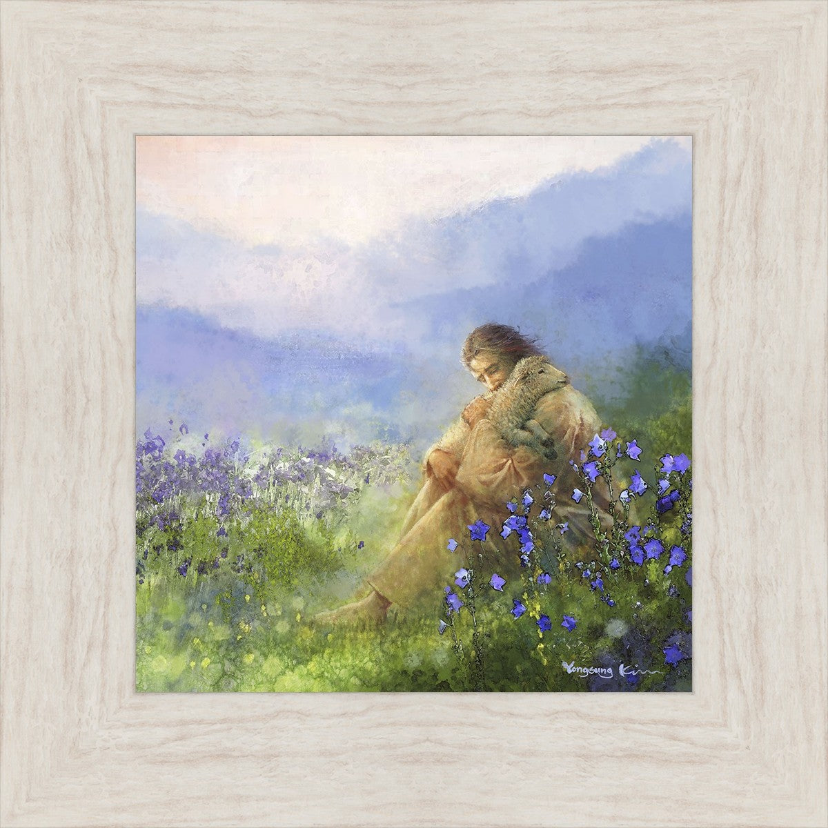 "Comforter" by Yongsung Kim portrays Jesus Christ tenderly embracing a lamb amidst a serene field of purple flowers beneath a calming blue sky, emanating divine comfort and compassion. This touching artwork evokes feelings of solace and compassion, resonating with viewers seeking spiritual reassurance and a deeper connection to their faith.