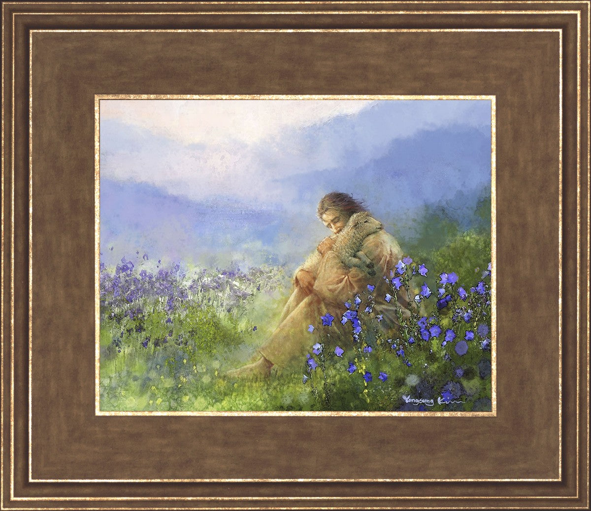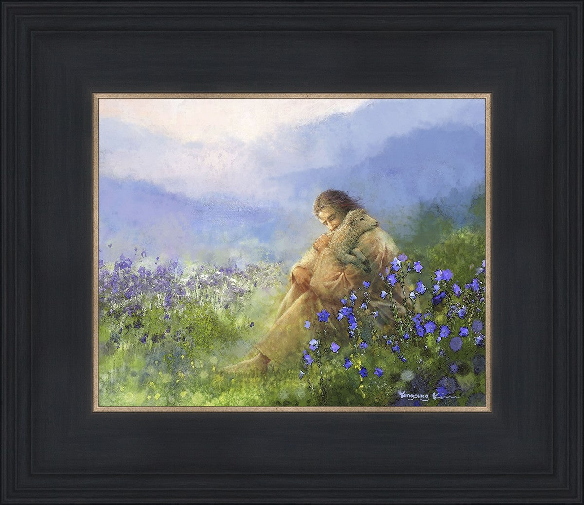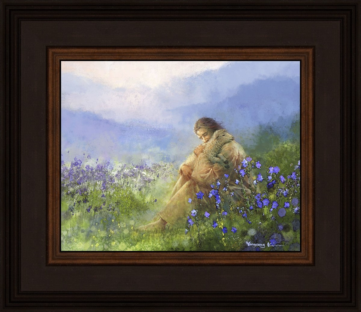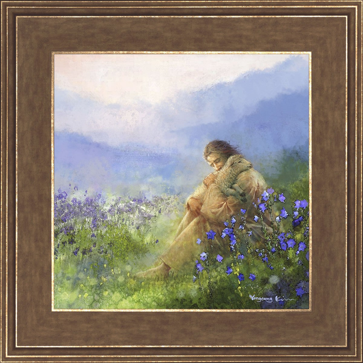 "Comforter" by Yongsung Kim portrays Jesus Christ tenderly embracing a lamb amidst a serene field of purple flowers beneath a calming blue sky, emanating divine comfort and compassion. This touching artwork evokes feelings of solace and compassion, resonating with viewers seeking spiritual reassurance and a deeper connection to their faith.