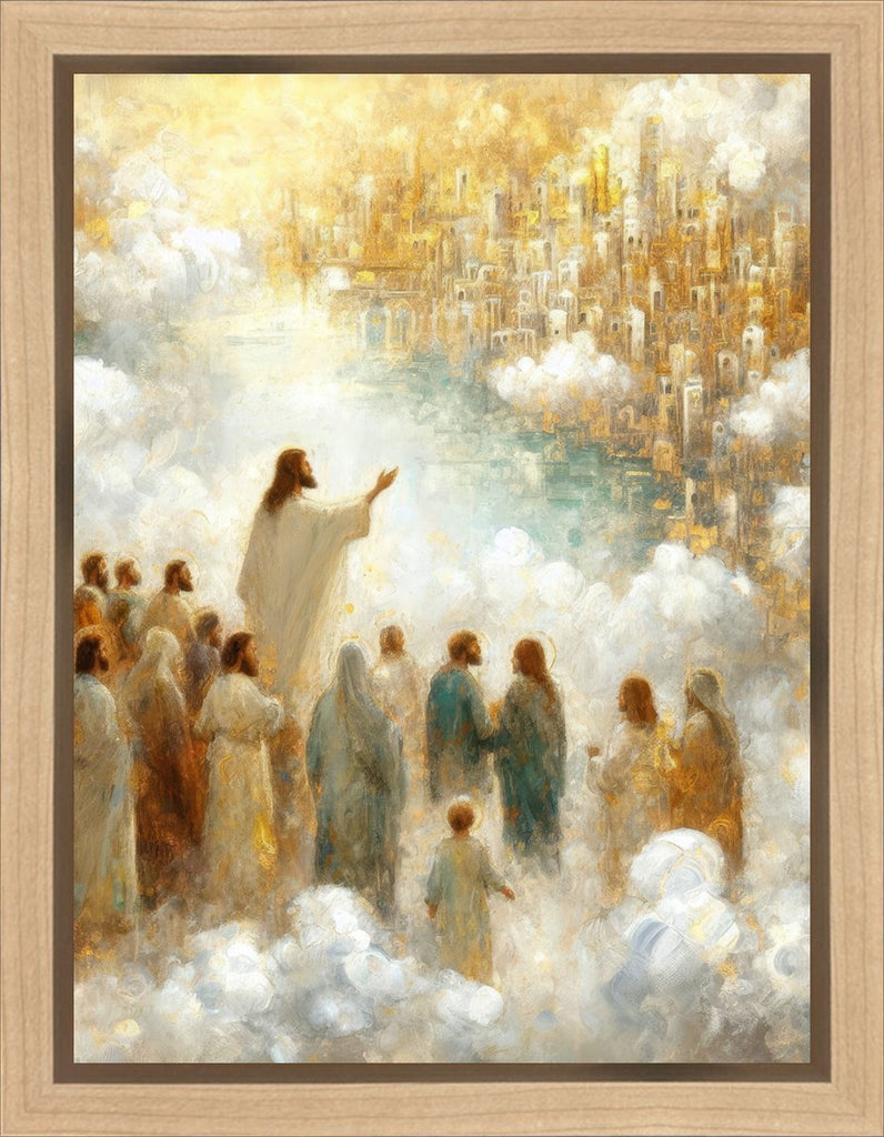 In creating “Kingdom Come”, we wanted to capture the deep longing in Jesus' prayer from the book of Matthew, "Your kingdom come, your will be done, on earth as it is in heaven." This scene shows Jesus surrounded by a crowd, all looking toward a radiant city in the distance - a vision of heaven breaking through to our world. For us, this piece reflects a hope for transformation: that our lives and communities could mirror the peace, love, and justice of God’s kingdom.