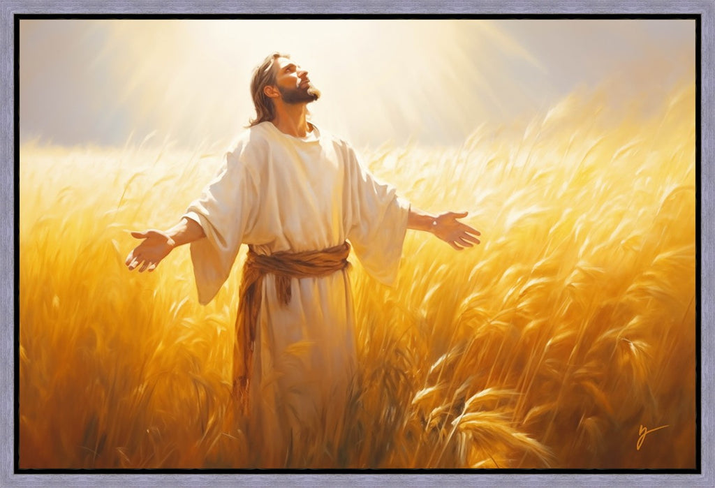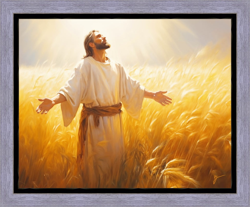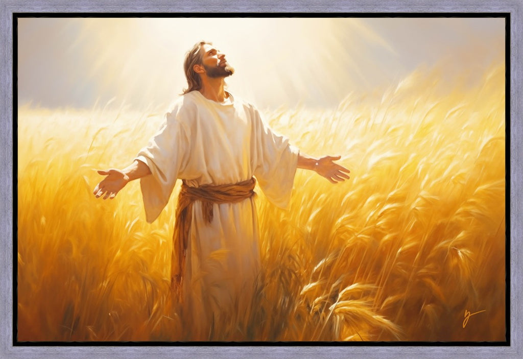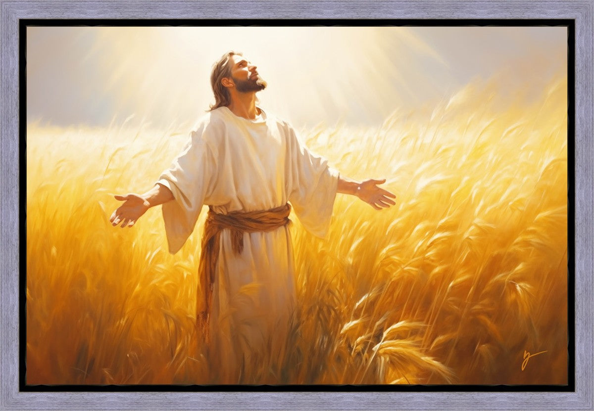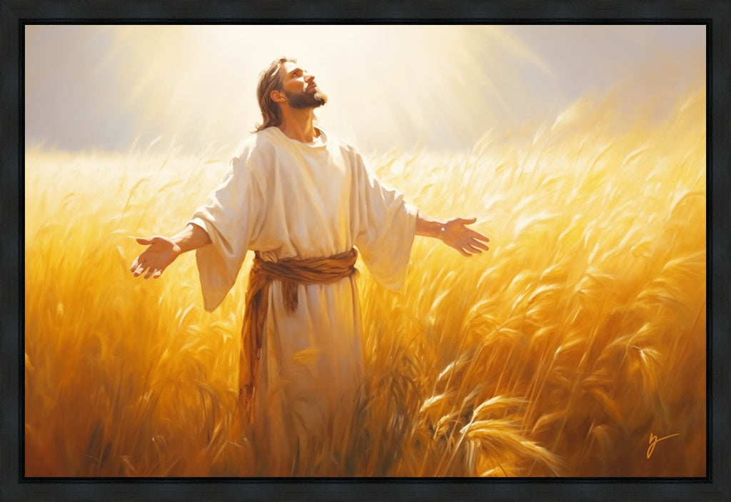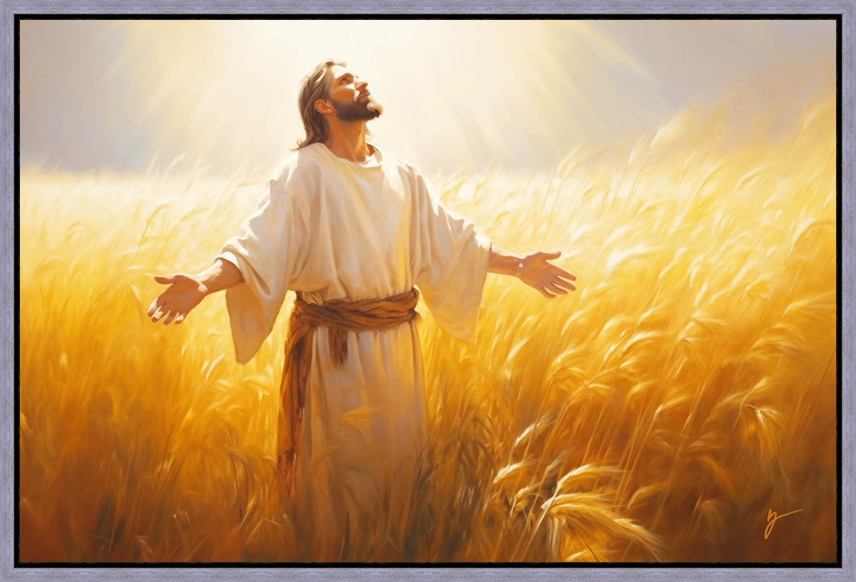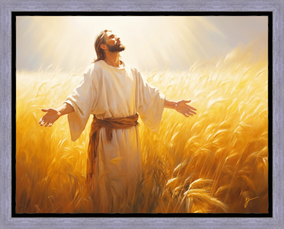 Radiant light bathes the scene in a golden glow, casting Jesus in divine brilliance as He looks heavenward. The ripened wheat reflects the glory of the mission, and the entire canvas is awash with celestial light. Jesus, adorned in white robes, stands as the beacon of hope, calling on His Father to send forth laborers.